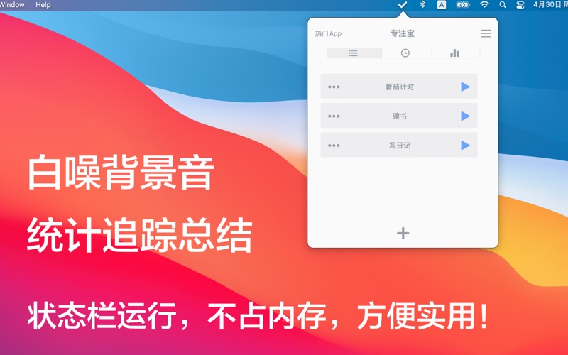 专注宝是一款基于番茄工作法的效率app,集合了番茄计时,白噪音,统计时长等功能,状态栏设计不占空间,这是一款简约又实用的时间管理工具,能极大提升您的工作学习效率。欢迎下载体验。 【主要功能】 - 番茄计时 - 白噪音音乐 - 定制化任务 - 状态栏显示 - 记录追踪 - 定制化铃声提醒 - 更多功能敬请期待 【联系我们】tommywu666@163.com 修复部分已知问题