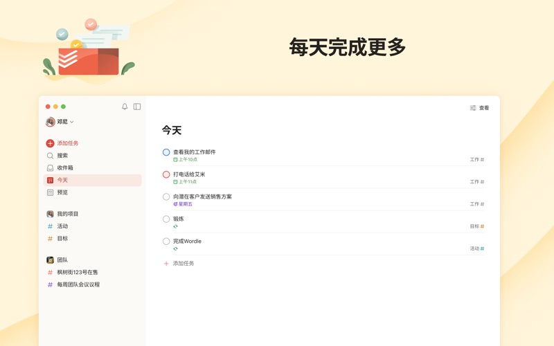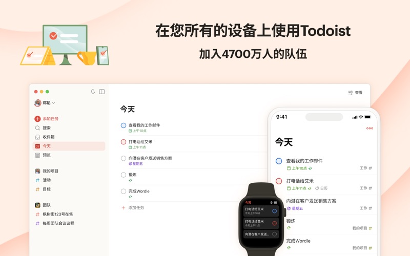 受到超过4700万个用户的信任,Todoist帮助个人和团队简化他们的任务管理。使用Todoist来快速整理您的思路,提升效率以及培养习惯。 只需轻轻一点,即可添加您的任务并且设置提醒,使用日历、列表和看板等多种视图,按照工作和/或个人生活来过滤任务,合作项目,最终获得心安。 为什么选择Todoist? Todoist是一个简单但是强大的任务管理工具,它将会帮助您管理您的工作和生活。 • 使用Todoist强大的日期识别和循环日期功能来添加任务“每周五下午计划下周工作”或者“每周三下午6点完成孩子的功课”,以便培养习惯。 • 使用列表、看板或者日历查看任何项目让您在计划您的任务以及时间安排时无比灵活。 • 在所有设备上可用,无论是应用、插件还是小组件,Todoist无处不在。 • 关联Todoist与您的日历、语音助手、Outlook、Gmail和Slack等超过100个其他工具。 • 分配任务给其他人来进行任何类型的项目合作。通过添加截止期限、评论和文件让相关内容近在手边。 • 通过模版帮助您跟进会议议程、会计工作、打包列表甚至是婚礼计划等任何事情。 • 设置直观的任务优先级来让最重要的事情一目了然。 • 深入分析您的个人效率趋势来让您更加了解自己的习惯。 macOS版Todoist • Todoist的设计优美直观,易于入门。 • 使用全局快速添加快捷键(option + space)来在想法和任务产生的瞬间捕捉它们,哪怕您当时正在使用其他应用。 • 使用日常用语尝试输入“明天下午4点”或者“每隔一周的周三”等日期,Todoist会帮您识别这些信息。 • 在您的Mac上保持有序,同时它也可以在iPhone、iPad和Apple Watch和其他设备上同步。 • Safari内嵌插件让您可以更加快速地计划您的一天并且将网站添加为任务。 • macOS版更多强大功能:Siri、今天小组件、分享插件和快捷指令。 • 打开多个窗口来一次性查看不同的视图或者任务,或者置顶悬浮的Todoist窗口以便随时访问它。 疑问?反馈?请访问todoist.com/help 备受瞩目: > The Verge: “Simple, straightforward, and super powerful” > Wirecutter: “It’s simply a joy to use” > PC Mag: “The best to-do list app on the market” *关于专业版付费*: 您可以免费使用Todoist,但是如果您升级到专业版方案,您的Apple账户将会被收费。您的账户将会在当前周期结束前的24小时内自动续订并被收取对应的费用,您可以选择按月或者按年支付。购买后,您可以随时在您的Apple ID账户设置中关闭自动续订。 我们刚刚完成了日常维护和故障修复来让一切正常运行。 选择您设置中的“最新动态”来查看更多优化和故障修复的详细内容。