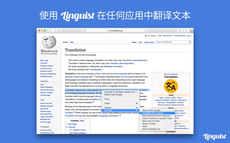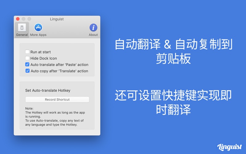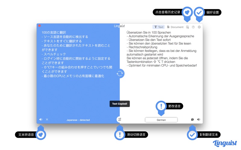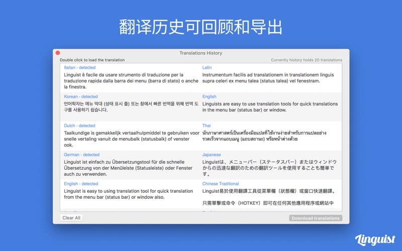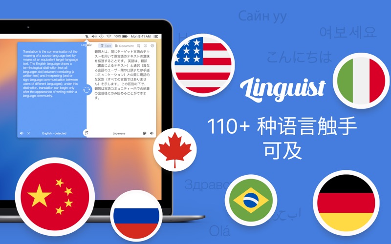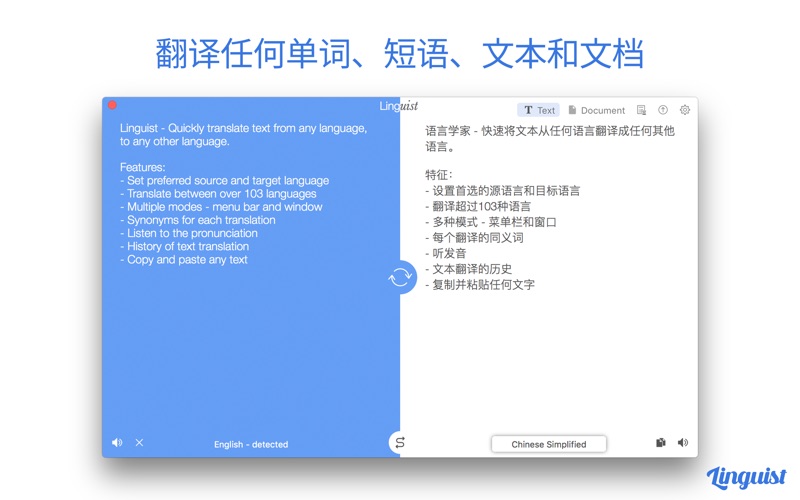 ≈ 主要特点:≈ ◉ 设置首选的源语言和目标语言 ◉ late在超过103种语言之间进行翻译 ◉ 以.txt,.rtf和.doc格式翻译文档。 ◉. 多种模式-菜单栏和窗口 ◉ text文字翻译历史,以供参考 ◉ 以TextEdit(.txt)格式导出翻译的历史记录 ◉ OT热键可翻译任何网站或应用程序中的文本 ◉ each每种翻译的同义词 ◉ 听发音 ◉ through通过快捷方式发送即时翻译。 ◉复制并粘贴文本。 ≈ 语言学家支持以下语言:≈ 'Afrikaans Albanian Arabic Armenian Azerbaijani Basque Belarusian Bengali Bosnian Bulgarian Catalan Cebuano Chinese Croatian Czech Danish Dutch English Esperanto Estonian Filipino Finnish French Galician Georgian German Greek Gujarati Haitian Creole Hausa Hebrew Hindi Hmong Hungarian Icelandic Igbo Indonesian Irish Italian Japanese Javanese Kannada Khmer Korean Lao Latin Latvian Lithuanian Macedonian Malay Maltese Maori Marathi Mongolian Nepali Norwegian Persian Polish Yoruba Portuguese Punjabi Romanian Russian Sebian Slovak Slovenian Somali Spanish Swahili Swedish Tamil Telugu Thai Turkish Ukrainian Urdu Vietnamese Welsh Yiddish Zulu' 重要说明:语言学家需要互联网连接才能执行翻译。 如果有任何建议,反馈,错误报告或其他任何内容,请随时与我们联系support@appyogi.com 谢谢你选择语言学家! 我们修复了错误并提高了性能,以提高您的应用体验。 不要犹豫,请将您的反馈发送到 support@appyogi.com。它可以帮助我们使应用程序变得更好。