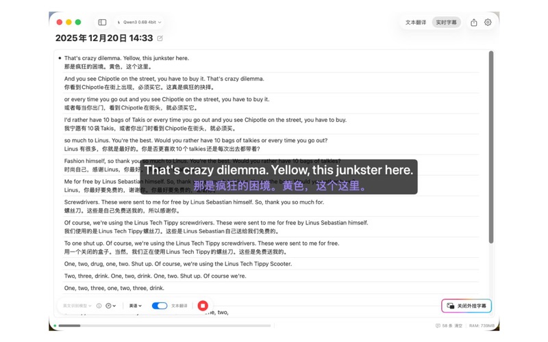 Lorqa 是一款适用于 macOS 的 AI 原生翻译和实时字幕应用。 它让文字的转换变得专注而高效——大型语言模型在你的设备上本地运行,将不同语言之间的文字准确而自然地翻译出来。无需网络,也无需担心隐私,一切都在你的电脑中完成。打开任何应用播放的视频(音频)即可开始低延迟精准转录,本地LLM实时翻译,悬浮双语字幕随意拖动并且支持多种自定义。支持25种语言转录,多种模型可选,助力用户看懂外语视频 核心功能: - 本地运行 LLM,支持Qwen3,Gemma3, 现已支持直接导入Ollama和 LM Studio模型 - 离线可用,无网环境下依然工作 - 数据仅存于本地,保护你的内容安全 - 简洁界面,专注翻译,和实时字幕 快捷键设置: 快捷键需要用户在 系统设置/隐私与安全/辅助功能/ + (从应用程序选择Lorqa) 自行设置,方可使用快捷键翻译功能。 关于自动续订 购买确认时,费用将从您的 Apple ID 账户中扣除。订阅将在当前订阅期结束前至少 24 小时未取消的情况下自动续订。在当前订阅期结束前的 24 小时内,您的账户将被扣除续订费用。购买后,您可以前往 App Store 的账户设置管理或取消订阅。 邮箱 jiangdi0924@gmail.com 条款:https://jdi-app.notion.site/Terms-5a99ba5bf942491b8299c07221bb5f7b 隐私政策:https://jdi-app.notion.site/Privacy-Policy-cdb1be6b87f64c06b7dbea6ffbbad83f 心路历程 翻译是一个很大众的需求,市面上各种各样的翻译软件层出不穷。有很多大公司出手参与此类应用竞争,可以说有很多翻译的解决方案。 过去很长一段时间我日常使用某款翻译软件,很方便只要选中文本快捷键即可完成内容的翻译,在使用过程中也有一些小的可以吐槽的点,例如:翻译速度太慢,翻译的文本数量会受到一些限制,一些长文本还是得通过其他方法。 我发现现在LLM(文本语言模型)也常作为翻译工具来使用,LLM有良好的多语言能力,现在Qwen3,Gemma3,这类小模型也具备很好的翻译能力。在使用LLM翻译的时候有很多的选择,大多数是网页版,也有一部分是本地部署的模型。这些产品通常没有为翻译场景打造出端到端的翻译体验,总是差点意思。 我过去做过PocketLM(移动端的LLM本地推理客户端),对于小LLM的能力水平有一定的了解,并且对于模型不同设备的推理速度和载入速度也很熟悉。于是我开始着手使用LLM打造这个端到端的翻译应用, 整个实现过程也相当顺利,经过测试我发现Qwen3 0.6B 4bit的效果已经和DeepL的翻译能力不相上下,我还同时增加了Qwen3 1.7B ,Gemma3系列模型作为备选为用户提供多重选择。 我制作这个产品的动机非常个人化。我比较关注这个需求是否有其他人真实存在。关于后续的规划也想听听其他人的反馈~ - 优化字幕识别准确性和及时性