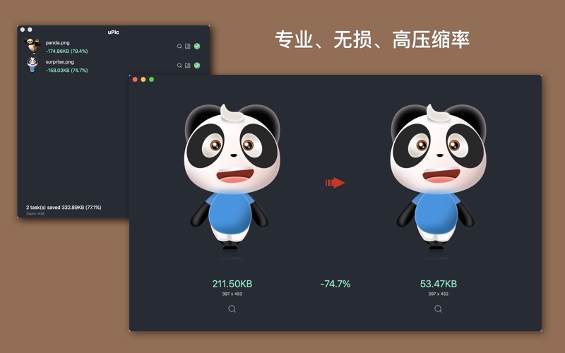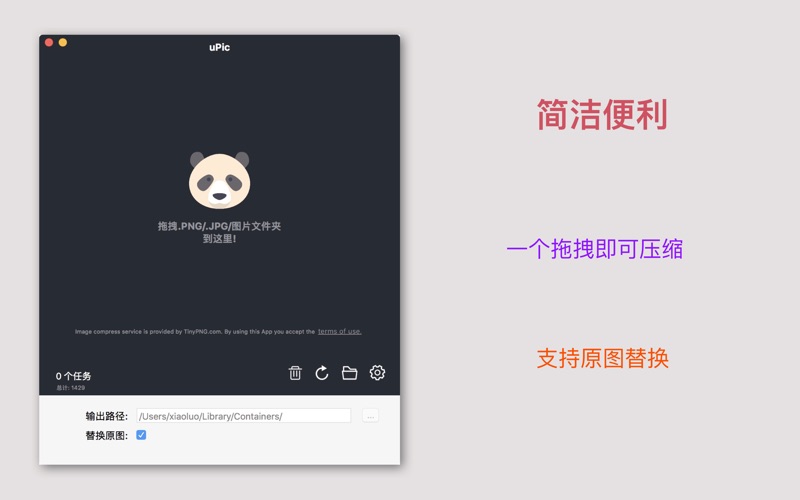 【简介】 uPic 是一款功能强大的图片无损压缩工具软件,引入了TinyPNG API的压缩算法,提供了PNG图片的"无损"压缩服务,文件大小减少60%-90%。经过压缩的图片可能只有原来的1/8的大小,但是质量却完美无瑕。 使用uPic,你可以通过简单的拖拽完成对PNG/JPG图片的压缩,无需打开浏览器,无需手动下载图片。您只需要一个动作完成整个服务,更便利... 【功能】 1. 支持PNG/JPG图片图片文件压缩 2. 支持拖拽整个文件夹,自动识别所有图片 3. 支持批量压缩 4. 支持压缩后自动替换原图 5. 支持全天24小时自动压缩,一天能压缩约7200张图片 【联系方式】 您有任何问题,可通过如下方式联系我 Email:rosesummersky@gmail.com QQ群:964622791 【订阅说明】 1. 订阅周期:1个月 2. 订阅价格:$0.99/月(美国地区适用) --- 不同地区的价格可能有所不同。费用将从 iTunes 帐户绑定的信用卡中扣取,付费帐户到期后将自动续订。如需取消续订,可以在当前付费周期结束前24小时进行操作。付费帐户激活后,将无法取消。购买后,可以在帐户设置中管理续订。 --- 隐私策略 https://luoxiao.github.io/tinypng/privacy.html 服务条款 https://luoxiao.github.io/tinypng/terms.html 1.提现程序兼容性 2.优化程序体验