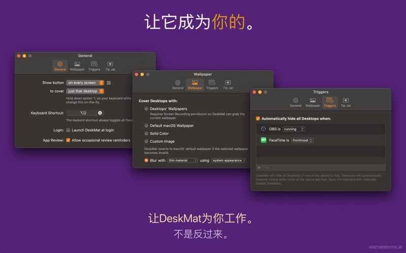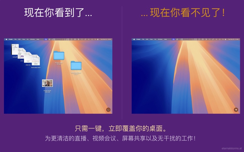 把东西扫到地毯下——虚拟地。 DeskMat 是一个虚拟的桌垫,可以通过点击一个按钮覆盖你桌面上的文件和文件夹杂乱。 为了更干净的直播、视频会议、屏幕共享和无干扰工作! = 隐藏桌面 = 只需点击一下,即可隐藏桌面,然后再显示出来。 如果你有多个显示器,可以选择只隐藏一个桌面或隐藏所有桌面。 = 最小化的用户界面 = 将 DeskMat 的按钮放置在你的主桌面、所有桌面或菜单栏中。 或者完全移除按钮,专门使用键盘快捷键和自动触发器。 = 自动触发器 = 当你指定的应用程序正在运行或进入前台时,DeskMat 会自动隐藏桌面。 将 DeskMat 与你的 Focus 模式配合使用! = 你的壁纸 = 使用当前的静态或动态壁纸、单色背景、定制图像,或者直接模糊桌面。 系统要求: - macOS 13 Ventura 或更高版本 - 一个凌乱的桌面(这并不是 真的 必需的) 关于应用内购买的说明: 应用内购买是你可以自愿给我提供的小费,用于支持这个和其他应用的开发。这些购买不会解锁任何额外的内容或功能——你通过最初购买应用即可获得 DeskMat 的所有功能。 DeskMat v1.2 (2025.09.11) contains the following new features and improvements: = NEW FEATURES = - Desktop widgets can now be optionally kept visible when covering your Desktop (macOS 14 Sonoma or newer) (2025.09.08) - Integration with Shortcuts.app (2025.09.08) - The new Control Widget allows you to cover your Desktop from the comfort of the macOS Control Center (macOS 26 Tahoe or newer) (2025.09.03) = IMPROVEMENTS = - Support for macOS 26 “Tahoe” (2025.09.05) Thank you for using DeskMat for Mac. I hope you're enjoying the app! If you have some time and if it's not too much to ask, please consider leaving a rating or review of DeskMat on the Mac App Store - it would help me out a lot! If you'd like to get in touch or connect with me, please visit https://eternalstorms.at/contact for all options. Yours truly, Matthias
