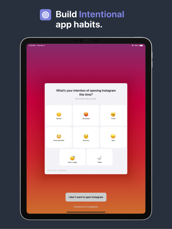 一寸光阴一寸金,寸金难买寸光阴。 对抗社交App算法,摆脱潜意识影响,重新掌控你的手机! 每当你打开一个已配置的App(微信、微博、抖音…)时,“one sec”会利用“快捷指令”自动切换屏幕,引导你进行一次深呼吸正念。短期内,“one sec”可以助你改变社交App的使用习惯(设置完成,立马见效)。长期来看,打开App前的一小段深呼吸正念,可以助你培养好习惯。 正念是一种积极的、开放的,关注、觉察当下的状态:你真的想打开微信吗?或者只是因为等车无聊?“one sec”帮助你觉察你的行为、想法和感受;用正念改变无益的社交App使用习惯。 Available Subscription Options: one sec pro (annual / monthly / lifetime unlock) Terms (EULA): https://www.apple.com/legal/internet-services/itunes/dev/stdeula/ Privacy Policy: https://one-sec.app/privacy/ - Big update for one sec’s conversational reflection intervention. Completely redesigned & improved tech stack. - App Icon picker updated and UI fixes. - Bug fixes around strict block of apps. - Fixes an issue where strict block limitations were already enforced while a strict block was being created. - one sec uninstall protection during strict blocks. - Fix “Re-Intervention” and “Always Ask” time picker animation glitch. - Fix selection of breathing prompt text – and simplified breathing prompt customization while we were at it. - Fix glitch in LENGO vocab list, now you can select and delete words again. - Fix one sec’s time budget intervention. Hope you like these improvements & bug fixes! If one sec helps you, please support our work by writing a review on the App Store. Thank you :) – Frederik