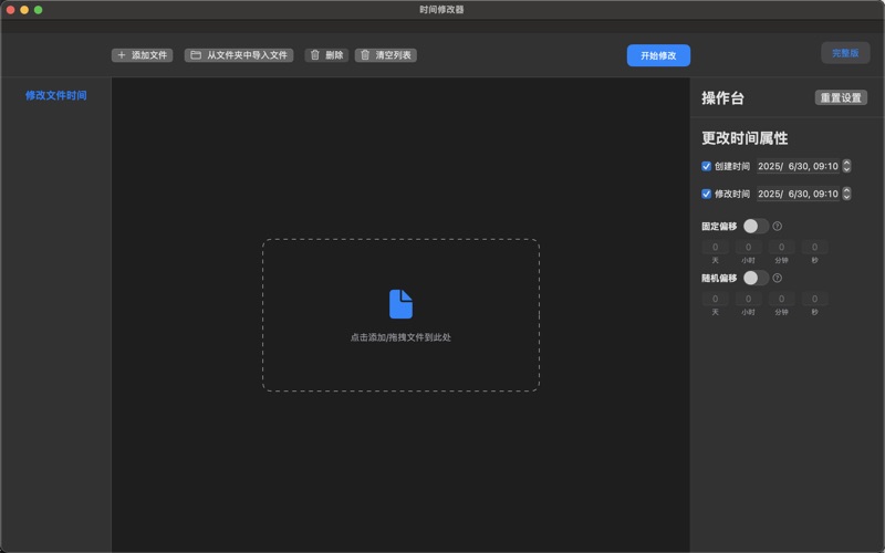 > 时间修改器是一款专为 macOS 用户打造的批量修改文件时间工具。 > - 支持批量导入文件和文件夹,自动去重 > - 一键修改文件的创建时间、修改时间 > - 拖拽操作,界面简洁易用 > - 支持高级功能解锁,无任何广告 > > 无论是整理照片、文档,还是批量处理素材,时间修改器都能大幅提升你的工作效率。 > > 如有问题或建议,欢迎通过技术支持邮箱联系我们。