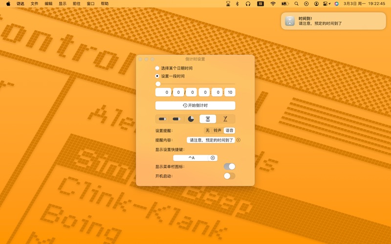 这是一个菜单栏上的倒计时 1.你可以设置到某个以日期时间,或者设置某一段时间为倒计时。 2.App提供了五种菜单栏按钮的显示样式,它会实时显示当前进度,并在倒计时结束时闪烁,足够显示你的个性。 3.在倒计时结束时,你可以使用播放铃声,或一段你设置的文本,App将为你朗读出来。同时,App会弹出通知,以便你能看到提醒。 4.你可以设置一个快捷键,快速呼出设置界面。把上面这两句翻译为英语,阿拉伯语,德语,俄语,法语,繁体中文,日语,西班牙语和越南语 问题反馈 macostool@qq.com 适配新版 macOS,优化使用体验。