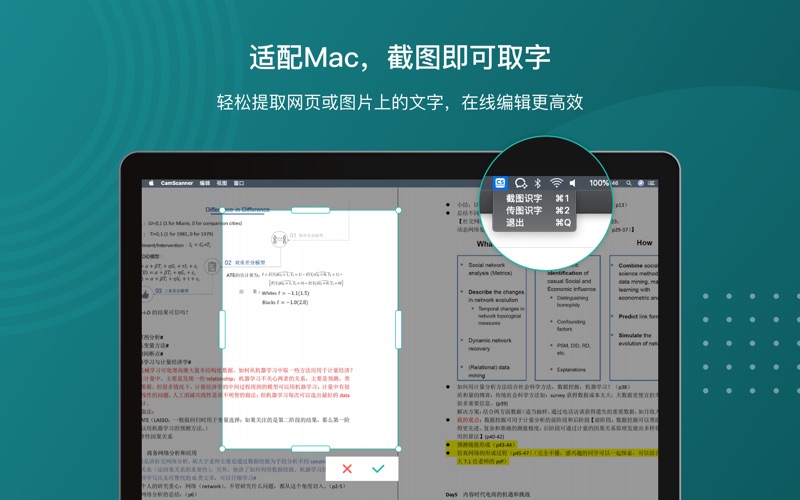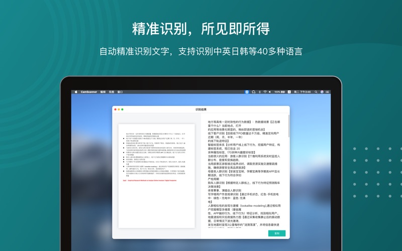 欢迎使用“Mac扫描全能王-文字识别”版本。现在你可以在手机、电脑、网页等多种设备或平台上使用“文字识别”功能啦~ 电脑截图或选择图片上传,扫描全能王能快速识别图片上的文字内容,并转换为可编辑文本。 【简介】 扫描全能王-是一款功能强大的图片扫描和文字识别工具,拥有行业领先的光学字符识别技术,能精准识别图片上的文字内容,并转换为可编辑文本。同时,支持手写体和竖排文字的识别。 【主要功能】 「截图取字」 自动精准识别和提取图片中的文字,支持识别汉语、英语、日语、韩语、法语、德语、西班牙语、马来语、泰语、越南语、葡萄牙语、意大利语等全球40多种语言。支持手写体和竖排文字的识别。 「传图识字」 提取您电脑上任意图片中的文字,提升您的工作效率。 若你喜欢扫描全能王,或者有其他任何意见,请花一点时间给我们写评论,或发邮件至isupport@intsig.com,这将帮助我们不断改进产品,给你更好的使用体验! ----关注我们 ---- 在新浪微博上关注我们 @扫描全能王 在微信上关注我们,搜索公众号:扫描全能王 在Twitter上关注我们 @CamScanner 在Facebook 上关注我们:CamScanner 在Google+上关注我们:CamScanner 1. 全新上线 AI PPT 功能,快速生成高质量演示文稿 2. 优化登录流程,使用更顺畅、更稳定 3. 修复已知问题,提升整体使用体验