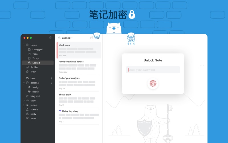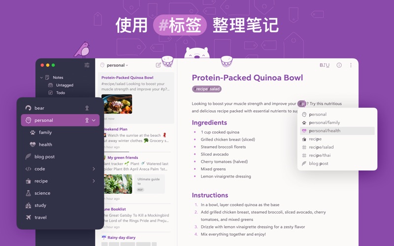 熊掌记是一款优雅且易上手的 Markdown 写作软件,帮助您捕捉灵感、便捷写作和规划待办,使生活井井有条。 从记笔记到计划一天,从整理思绪到创建表格,列下清单和任务,随心速写,连接笔记,或者写下一整本书,还有无限可能等您探索。 无论是作家、律师、厨师、CEO、教师、医生、工程师、学生、家长都在使用!上手极其简单——甚至无需注册或创建账号。 您只需要打开熊掌记,新建一篇笔记,自在记录。 “熊掌记是我的日志应用首选”——Kit Eaton,《纽约时报》 *2017 Apple 设计奖 *2016 App Store 年度应用 *连续 7 年入选编辑选荐 *我们大多数人的父母都喜欢 ## 优雅、简单、 强大、安全 - 助您潜心写作而不被任何工具干扰 - 通过熊掌记的应用程序扩展来剪藏网页和其他内容 - 经过重新设计的信息面板已增加目录和反向链接功能 - 支持所有文字格式,包括从右至左的语言,如阿拉伯语、希伯来语和波斯语 - 用 Siri 和捷径轻松创建笔记 - 你的笔记只属于你——隐私权是熊掌记的核心价值观: 我们不能看到你的笔记、标签或其他任何信息 ## 灵活的 Markdown 语言 - 纯文本——易于在不同应用程序之间迁移 - 保留粗体、斜体、删除线、链接、表格等风格,或更多 Markdown 格式 - 组合多种特殊格式如粗体和下划线(甚至在标题中) - 隐藏 Markdown起来以获得更纯粹的阅读体验 - 使用维基链接连接笔记来建立个人维基或知识管理工具 ## 使用#标签#、待办事项等高效整理 - 在笔记的任何地方添加 #标签,#分词 标签#,甚至#多个/嵌套/标签#,以便快速整理笔记 - 将重要标签在侧边栏置顶 - 使用标签图标来凸显侧边栏中重要的标签 - 添加待办,轻松查看所有含待办事项的笔记 - 折叠需隐藏内容以提高专注力 ## 轻松共享 - 将笔记导出为纯文本、Markdown、TextBundle、熊掌记笔记和富文本格式 - 将笔记导出为 HTML、DocX、PDF、JPG 和 ePub格式(需订阅 Bear Pro) - 通过共享菜单将您的笔记轻松分享至任何第三方应用程序 ## 深度搜索 - 使用 Spotlight 从任何地方搜索您的笔记 - 搜索图片和 PDF 中的文本(需订阅 Bear Pro) - 通过强大的特殊搜索选项(如 @待办、@图片 和 @昨天)来搜寻特定类型的笔记 ## 打造您的舒适区 * 近 30 款主题任您挑选,无论是在浅色或深色模式下都能获得完美的写作体验(需订阅 Bear Pro) * 选择最契合您个性的应用图标(需订阅 Bear Pro) * 为文本、标题和代码自定义字体 * 自由设置行高和行宽,段落间距,还有为中文特别设计的段落缩进 ## 订阅 Bear Pro 解锁更多强大功能 只需订阅 Bear Pro 即可在您的所有设备上解锁各种高级功能,并获得无限个熊抱! 支持熊掌记的开发,使我们能够为您持续推出版本更新和更多新功能。 - 通过 iCloud 在您的 iPhone、iPad 和 Mac 之间同步笔记 - 设定完全私密的密码加密单篇笔记 - 通过 Face/Touch ID 锁定熊掌记 - 更多导出格式,包括 HTML、DocX、PDF、JPG 和 ePub - 图片和 PDF 内文本搜索 - 20+ 精美应用主题和应用图标 每月 2.99 美元 每年 29.99 美元 这两种方案都提供 14 天的免费试用期 ----- 订阅价格可能因地区而异。订阅费用将通过您的 App Store 账户从默认付款卡中扣除。 您的订阅将自动延续,除非在当前订阅期限结束前至少 24 小时取消。 订阅一旦激活将无法取消。 购买订阅后,可以在 App Store 账户设置中管理你的订阅。 免费试用期的任何未使用部分将在用户购买订阅时被取消。 ----- bear@shinyfrog.net Twitter: BearNotesApp Reddit: reddit.com/r/BearApp Facebook: BearNotes Instagram: BearNotesApp 微信公众号:Bear熊掌记 微博:@Bear熊掌记 隐私政策:http://www.bear.app/privacy/ 服务条款:http://www.bear.app/terms/ - Resolved a crash triggered when toggling column visibility in full-screen mode - Refactored and optimized pasteboard management for improved stability - Implemented multiple enhancements to Bear’s Web Clipper for more reliable data capture - Corrected an issue preventing consistent thumbnail generation - Fixed a state-synchronization bug that could leave the editor in an inconsistent state