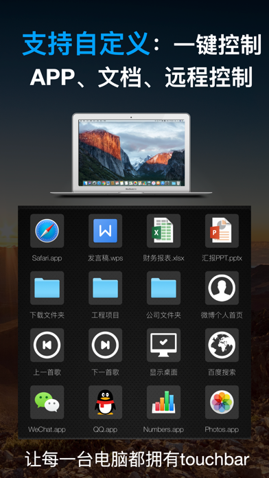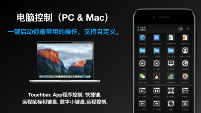 有没有想过,通过iPhone来控制Windows和Mac电脑?你可以创建APP、文件、文件夹、网站、键盘快捷键的快捷操作,只需要一个按钮,就可以完成复杂的一系列操作。远程关机、鼠标键盘、锁屏、一键截屏就更不在话下。 通过Controlax,让你的iOS 设备“1步1秒”化身电脑的Touch Bar和触摸控制板。 超控Controlax强大到可以做什么? •1秒连接 & 全自动匹配 让手机自动发现你的电脑,或者通过扫一扫 1步连接。 •支持自定义配置的Touch Bar、电脑快捷控制 你可以创建APP、文件、文件夹、网站、键盘快捷键的快捷操作,只需要一个按钮,就可以完成复杂的一系列操作,重新定义电脑的办公方式,效率提升300%。 •Touch Bar电脑快捷控制&远程电脑控制 放在电脑旁边是快捷控制器,离开电脑是电脑远程控制器。程序切换、窗口切换、窗口最大化、锁定屏幕,通通一键搞定,从此抛弃虐心的快捷键。 •远程鼠标&键盘 触控板还支持文件拖移,网页双指滚动。 •化身数字小键盘 无论你是Excel报表达人,还是计算器常客,效率都能提升200% •独有的双通道连接技术 通过革命性的双通道技术,您的每一个操作都同时经过互联网和局域网,并且经过了精心的数据校验 ,这带来了无与伦比的稳定性。 •无限操作距离: 互联网连接模式让Controlax的操作超越距离限制,不用担心因为办公室和家里太大丢失连接。 系统要求: -iOS 8 或 更高版本 -macOS 10.10 或 更高版本 -Windows 7 或 更高版本 # 支持语言选择 # 支持横屏