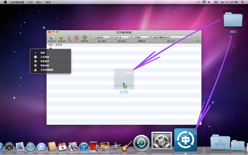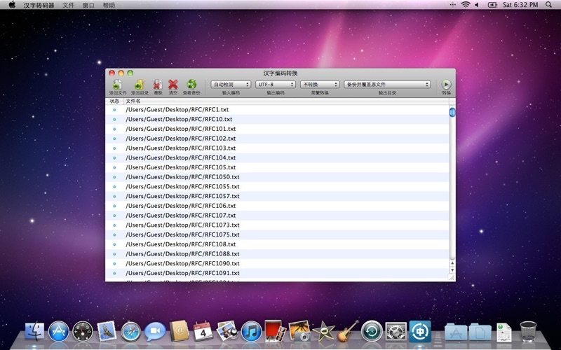 汉字编码转换是一个批量转换中文文本编码与简繁体的小工具。支持UTF-8、GB18030、BIG-5三种编码之间的互相转换,可自动检测源文件的编码,并可指定输出文本采用简体或繁体字符(BIG-5只能支持繁体字符)。程序使用的简繁转换引擎基于词语而非单字,因而能够有效提高简繁转换的准确率。 ---------------- 使用方法 ---------------- 1. 点击添加文件、添加目录按钮,或使用拖曳方式选择源文件; 2. 设定输入输出编码、简繁转换,选择输出目录; 3. 点击转换按钮开始处理。 ---------------- 常见问题 ---------------- 程序无法检测某些文件的编码 请手工指定文件编码后转换,或尝试在偏好设置中调低检测引擎的最低可信度(不建议,可能导致编码判断错误)。 转换结果呈现乱码 请检查输入编码选择是否与源文件实际编码一致。 转换结果丢失部分字符 一般出现在输出编码为BIG-5时,因字符集有限从而导致部分字符丢失,如果没有特殊需求,尽量不要采用BIG-5作为输出编码。 转换失败 请检查输入编码选择是否与源文件实际编码一致,以及是否具有输出目录的写入权限。 如何转换非TXT扩展名的文件 在偏好设置中,添加需要处理的文件扩展名,如“txt, htm, html”。 如何在添加目录时递归搜索子目录下的所有文件 在偏好设置中,勾选“添加目录时递归搜索其子目录”。 • 更新应用程序图标为 Big Sur 风格