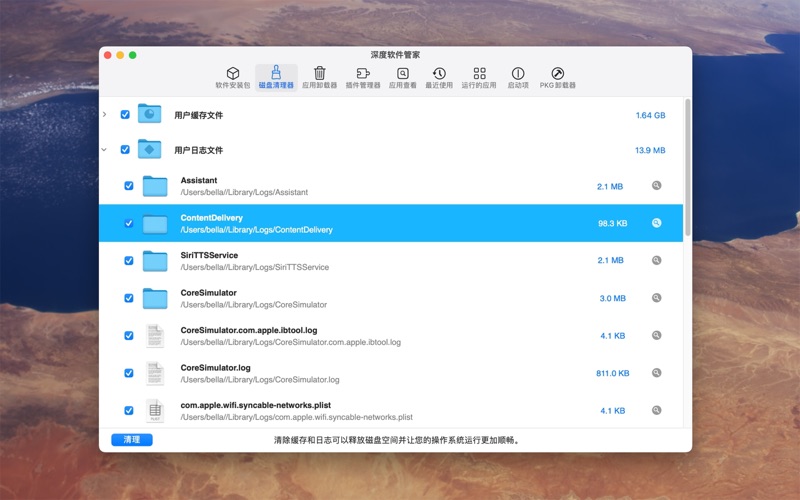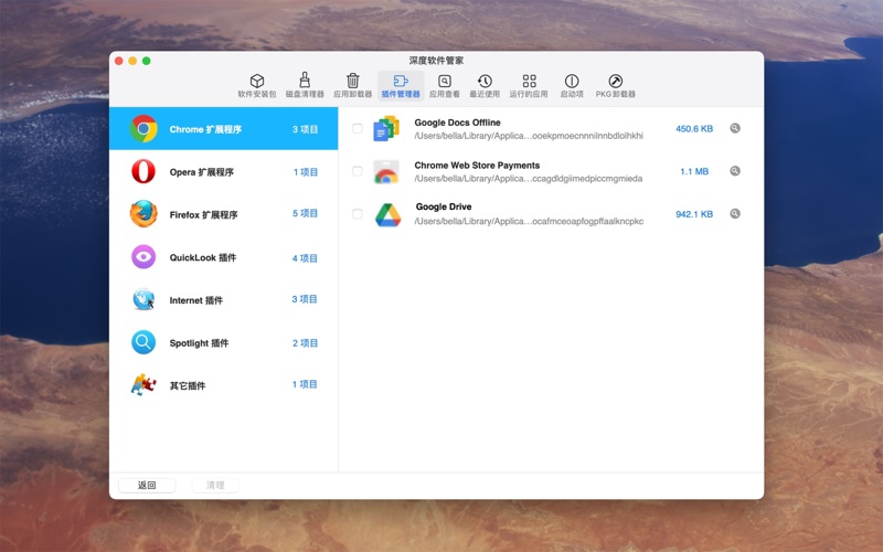 《深度软件管家》具有许多模块和全面的功能。主要功能有: 1. **安装包移除** - 免费 查找并删除您不再需要的软件包,以释放磁盘空间。 - Mac 软件安装包。 - iOS 软件安装包。 - Windows 软件和 Windows 软件安装包。 2. **应用程序卸载** 卸载整个应用程序,包括所有相关文件。 - 正确卸载应用程序。 - 将应用程序重置为初始状态。 3. **插件移除** - 删除不需要的插件。 - 查找并列出浏览器(如Chrome、Firefox和Opera)的扩展,以便轻松删除。 - 查找并列出QuickLook、Internet和Spotlight插件。 4. **Pkg卸载** - 免费 - 提供如何使用 'pkgutil' 工具完全删除所谓的 '包'(具有文件扩展名 .pkg)以及它所有安装内容的说明。 5. **查看应用程序信息** - 免费 - 查看已安装应用程序的信息,如版本、大小、开发语言、应用程序沙盒等。 6. **列出最近打开的应用程序、启动项和运行中的应用程序** - 免费 - 查看最近使用的应用程序。 - 查看随系统启动的启动项。 - 查看当前正在运行的应用程序。 7. **磁盘清理** - 免费 - 清除缓存和日志,以确保操作系统保持流畅运行,释放宝贵的磁盘空间。 完整版本解锁功能: 1. 应用卸载 2. 插件移除 联系方式: 如有任何问题,您可以通过电子邮件(gohelp2022@hotmail.com)与我们联系。 - 修复Bugs