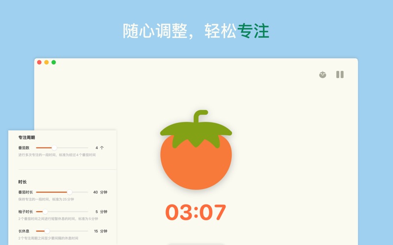 番茄与柚是一款专为 Mac 设计的番茄工作法工具,让专注更深入,休息时真的在休息。 通过创新的专注与休息机制,帮助您高效自律、轻松管理时间。无论是学生、作家、律师、CEO、自由职业者还是职场达人,都能在番茄与柚中找到属于自己的节奏。无需复杂设置,一键开启专注与休息的艺术。 - 专为 Mac 用户量身打造 - 创新番茄-柚子双形象,番茄即专注,柚子即休息,专注与休息分明 ## 专注更深入 - 自定义番茄、短休息、长休息时长,根据自身情况调整专注流程 - 迷你番茄窗口,桌面悬浮,可爱陪伴每一刻 - 精选白噪音,营造沉浸式专注环境 - 番茄笔记,随时记录闪念,避免专注状态被念头夺走,保持专注 ## 休息时真的在休息 - 柚子屏保,休息时自动接管屏幕,强制离开,真正放松身心 - 精选休息活动建议,避免突然停下的茫然 - 好好休息模式,短休息无法中断,确保休息质量 - 柚子笔记,休息时保存提示,思绪不丢失 ## 减少倒计时焦虑 - 心流模式,倒计时数字隐藏,减少焦虑 - 图标颜色模拟成熟过程,可视化时间流逝,减少数字焦虑 ## 高效极简笔记系统 - 笔记系统,支持笔记搜索、归档与恢复,灵感与思考井井有条 - 迷你番茄、状态栏,笔记双入口,想怎么记,就怎么记 ## 全面统计与数据洞察 - 统计专注与休息时长、次数,助力持续优化 - 长休息屏保自动总结专注周期数据,清晰掌握进步轨迹 ## 订阅解锁更多强大功能 订阅番茄与柚 Pro,解锁各种高级功能。支持番茄与柚的开发,使我们能够为您持续推出版本更新和更多新功能。 - 迷你番茄窗口 - 屏保系统 - 心流模式 - 好好休息模式 - 状态栏图标管理 支持月度与年度订阅,试用期内免费体验全部高级功能。 让每一分专注都更有价值,让每一次休息都真正恢复活力。立即体验番茄与柚,开启专注与休息的全新旅程。 使用条款:https://enzolu.com/terms/ 隐私条款:https://enzolu.com/privacy-policy/ - 支持英文 - 优化界面显示