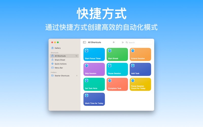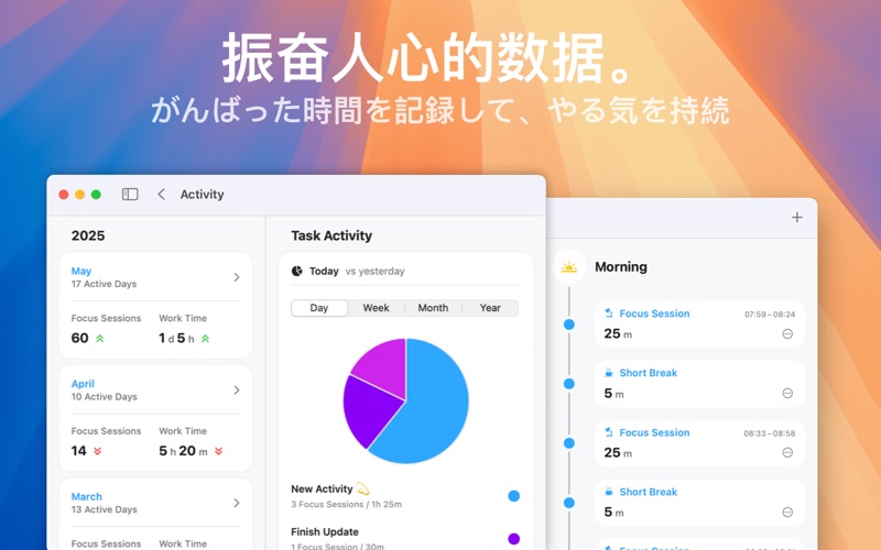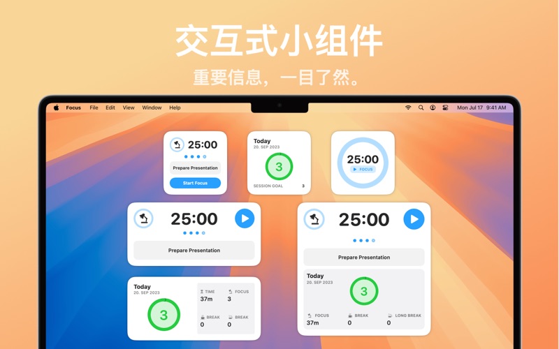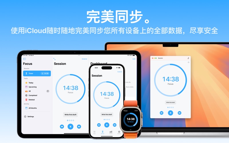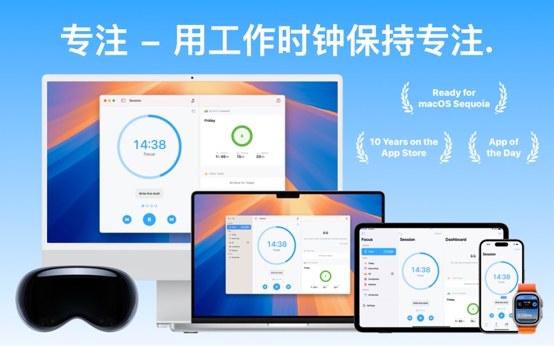 试试 Focus:iPhone、iPad、Apple Watch 和 Mac 最佳时间管理工具。 Focus 以最优雅与专业的方式完成更多工作内容。 用工作时钟保持专注,一次完成一项任务。 “[…] 可以大大提高工作生产力的工具" – MacStories.net “[…] 所有容易分心或一工作就忘了休息的人都该配备这项工具。" – iDownloadBlog.com ====================== 功能 ====================== FOCUS 会话 Focus 会话是非常有效率的工作方式。 专注 25 分钟,然后短暂休息以放松身心。 完成四个工作时段后,进行 15 到 20 分钟的长时间休息。 这种方法可以最大程度利用精力、刺激创造力,并提高成就感。 任务管理器 Focus 内含一个轻量级的任务管理器,让您可以直观地安排想从事的工作内容。 一次只进行一项任务,有效减少分心,集中精力完成目标。 完美地步向成功之路。 深度统计 时刻关注进度! Focus 会保留所有工作内容并做出深入且激励人心的统计。 查看每日、每周与每月的活动,才不会失去全局视野。 无所不在的 FOCUS 您可以使用 iCloud 在 iPhone, iPad, Apple Watch 与 Mac 上同步 Focus,实现无缝切换的互通体验。 您还可以使用快捷方式创建高效的自动化模式,或者使用小组件查看重要信息。 无所不在的 Focus 随时为您服务! FOCUS 与 APPLE WATCH:完美组合 在手腕上使用 Focus 再自然不过。 独立的 Apple Watch 应用程序有着方便与轻量级的互动内容,让您可以随时控制会话并跟踪进度。 有了 Focus 复杂功能,您可以自订腕表表盘以便一眼掌握当前进度。 漂亮的界面 正如其名:Focus 让您专注在最重要的事情上。 它的设计不喧宾夺主,平易近人且易于使用。 各项功能,即用即会。 ===================================== 订阅费用——所有应用,统一定价 ===================================== Focus 需要订阅。 $49.99/ 年(美元) $8.49/ 月(美元) 订阅订阅即可解锁所有设备上的 Focus(iPhone/iPad, Apple Watch 及 Mac)。 订阅支持家人共享。 免费试用 所有功能均可享 7 天免费试用(随年度订用附赠)。 若您在试用期到期前取消订阅,您依然可以使用此应用 7 天,无需支付任何费用。 订用条款 在确认购买且免费试用期结束后,即会通过您的 Apple ID 账户扣款。 订阅将会自动续订,除非在当前订阅期结束前至少提前 24 小时关闭自动续订。 将于当前订用期到期前 24 小时内从您的账户扣款。 您可于购买后前往 App Store 的账号设置管理或取消订阅。 ====================== 联系方式 ====================== 如果您有任何问题或建议,请联系我们:support@meaningful-things.com 网址:https://meaningful-things.com 隐私政策:https://meaningful-things.com/privacy 服务条款:https://meaningful-things.com/terms NEW: Share your Focus stats with friends! Stay focused, track your focus time, and celebrate your progress! You can now share your Focus statistics with friends or colleagues to stay motivated together. In Activity, tap Share and choose which achievement you’d like to share: * Today’s Focus stats * Daily session goal reached * Last month’s progress Celebrating your success can help you stay motivated and build a lasting habit of focus. We hope you enjoy Focus and these improvements. If you have any feedback or suggestions, feel free to reach out to us at support@meaningful-things.com – we’d love to hear from you! And if you enjoy our work and want to support us, we’d be so happy if you could take a moment to leave a review on the App Store. Thank you!