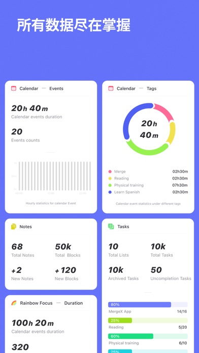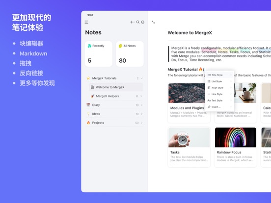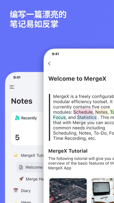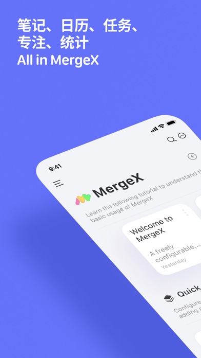 MergeX是一个可自由配置的模块化工具,通过它内置的众多模块及插件,你可以轻松定制出属于自己独一无二的工作流,真正的做到All in MergeX。 1. 内置「笔记」、「任务」、「日历」、「专注」、「统计」五大核心模块,并且每个模块都具备完善的功能和优秀的交互体验,让你可以在同一个App中完成更多事情。 2. 配合模块插件,定制属于你自己首页。MergeX首页是一个高度定制化的页面,你可以通过不同模块插件的组合,轻松配置一个真正适合自己的工作流,打造只属于你自己的App。 3. 完整适配iPhone、iPad、Mac版本,让你在所有设备中都有最佳体验。 4. 看腻了?没关系!MergeX内置多达七款精美设计的主题样式,动动手指即可更换一套全新的用户界面。 5. 未来的无限可能,MergeX目前还是起步阶段,未来会有更多体验优秀的模块集成到它内部,你可以跟它一起成长! ## 主要模块 * 笔记 - 基于块,支持Markdown语法样式并且拥有笔记文件夹,标签,反向链接系统,让你可以快速高效的完成一篇笔记。 * 日历 - 支持时间线和列表两种样式的日历模块,可以创建时间段或计时两种日历事件,使用它可以快速根据日历安排你的日程。 * 任务 - 便捷的任务清单模块,创建清单或者为相同类型的清单分组都不在话下(后续迭代中会增加看板模式,让任务模块变得更加强大)。 * 彩虹专注 - 支持正计时、倒计时两种类型,包含两种专注样式和多种不同的专注声音,同时提供一套完善可靠的专注统计。 * 统计 - 整合所有模块的数据,让你在同一个页面快速预览所有模块的统计数据。 ## 优秀的交互体验 MergeX致力于用简单的方式处理复杂的事情,我们极其注重软件的用户体验,并希望你可以在享受丰富功能的同时,得到最优质的体验。MergeX包含了单独适配的iPhone、iPad、Mac 版本,让你可以在不同的设备间保持一致的用户体验。 ## 隐私保护 我们极其注重您的数据安全。MergeX没有使用任何可能会收集您数据的框架,我们也无法接触到您在MergeX中生成的任何数据。所以MergeX不会收集任何信息,您可以放心使用! ## 购买和订阅 MergeX可以免费下载。您可以使用MergeX中的大部分功能。有一些特定功能需要按月度或按年度订阅才可使用,这确保了MergeX的持续发展,让我们可以提供更多丰富的模块和插件改进它的使用体验。 您可以在程序内使用iTunes自动续订功能获取会员专属功能,我们提供: * MergeX Pro - 月度会员 * MergeX Pro - 年度会员 在确认购买后,将会从您的iTunes账户中收取费用。您可以在每个周期结束前24小时取消下个周期的订阅,每个周期结束24小时内将会自动续订,已订阅的周期将无法取消。 ## 问题和反馈 您在使用MergeX中发现的任何问题都可以随时和我们联系,我们很乐意为你提供帮助。 隐私政策:https://mergex.app/privacy 使用条款:https://mergex.app/terms MergeX 1.6.1现已支持全新的iOS、iPadOS和macOS。此次更新带来了以下功能: - 修复了在iPadOS下导出笔记时导致的崩溃问题; - 修复了macOS版本在调整系统颜色模式后,应用程序未能同步更新颜色模式的问题。