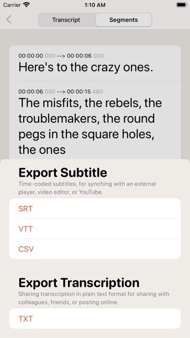 离线转录提供了一种快速且保护隐私的方式来转录音频、视频和播客文件。 如果您正在寻找用于转录的应用程序 - 会议纪要。 - 课堂录音。 - 为 YouTube 视频创建字幕。 - 将播客转录成文本。 - ETC。 ◼ 特点: - 没有数据离开您的 Mac。转录在本地进行,无需互联网。 - 易于使用的界面。您只需拖放+一键单击即可。 - 支持的格式: - 音频:mp3、wav、m4a、ogg、aac 和 caf - 视频:mov 和 mp4 - 导出格式:text、srt、vtt 和 csv。 - 一次转录多个文件。 ◼ 支持100种不同语言 该应用程序可以转录 100 种不同语言的音频: 南非荷兰语、阿尔巴尼亚语、阿姆哈拉语、阿拉伯语、亚美尼亚语、阿萨姆语、阿塞拜疆语、孟加拉语、巴什基尔语、巴斯克语、白俄罗斯语、波斯尼亚语、布列塔尼语、保加利亚语、缅甸语、加泰罗尼亚语、中文、克罗地亚语、捷克语、丹麦语、荷兰语、英语、爱沙尼亚语、法罗语、芬兰语、法语、加利西亚语、格鲁吉亚语、德语、希腊语、古吉拉特语、海地克里奥尔语、豪萨语、夏威夷语、希伯来语、印地语、匈牙利语、冰岛语、印度尼西亚语、意大利语、日语、爪哇语、卡纳达语、哈萨克语、高棉语、韩语、老挝语、拉丁语、拉脱维亚语、林加拉语、立陶宛语、卢森堡语、马其顿语、马达加斯加语、马来语、马拉雅拉姆语、马耳他语、毛利语、马拉地语、蒙古语、尼泊尔语、挪威语、挪威尼诺斯克语、奥克西唐语、普什图语、波斯语、波兰语、葡萄牙语、旁遮普语、罗马尼亚语、俄语、梵语、塞尔维亚语、绍纳语、信德语、僧伽罗语、斯洛伐克语、斯洛文尼亚语、索马里语、西班牙语、巽他语、斯瓦希里语、瑞典语、他加禄语、塔吉克语、泰米尔语、塔塔尔语、泰卢固语、泰语、藏语、土耳其语、土库曼语、乌克兰语、乌尔都语、乌兹别克语、越南语、威尔士语、意第绪语、约鲁巴语 使用条款:https://offlinetranscription.com/terms/ 隐私政策:https://offlinetranscription.com/privacy/ 在选择非英语源音频语言时改进转录。