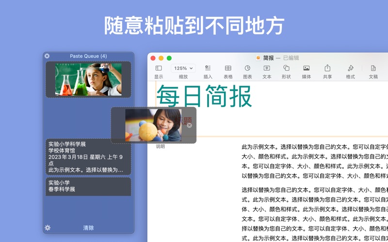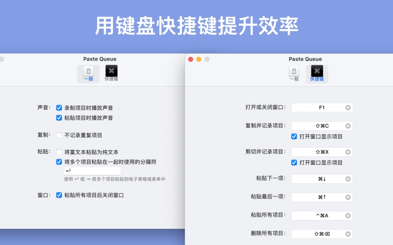 Paste Queue 能让您很快速地复制和粘贴多项数据! 有了它,您可以轻松地复制多个项目(例如,文字、图像、文件等等),而不会丢失任何一项。 然后,您可以一次性将它们全部粘贴,或者逐个粘贴到需要的地方。 例如,先连续地复制一个名字、电话号码和地址,然后按一个键盘快捷键,将它们全部一次性粘贴到表格的不同位置,无需在源位置和目标位置之间多次来回切换! 主要功能: • 轻松复制:快速复制文字、图像、文件等,而不会丢失任何数据。 • 弹性粘贴:一次性粘贴所有项目,或者按您喜欢的顺序逐个粘贴。 • 键盘快捷键:使用自定义快捷键快速复制和粘贴。 • 拖放功能:轻松将项目移动和粘贴到指定位置。 • 保持格式:将富文本粘贴为纯文本,以确保一致性。 • 文字分隔符:自动在项目之间插入分隔符,以便更好地组织粘贴的数据。 • 快速打开窗口:通过菜单栏图标或键盘快捷键快打开应用程序。 • 整洁有序:自动删除已粘贴的项目,保持队列的清洁。 用 Paste Queue 快速复制粘贴,轻松又省时! • 修复软件错误