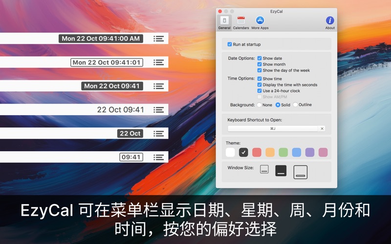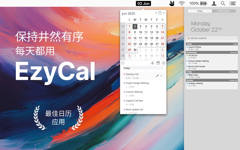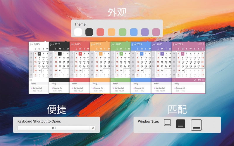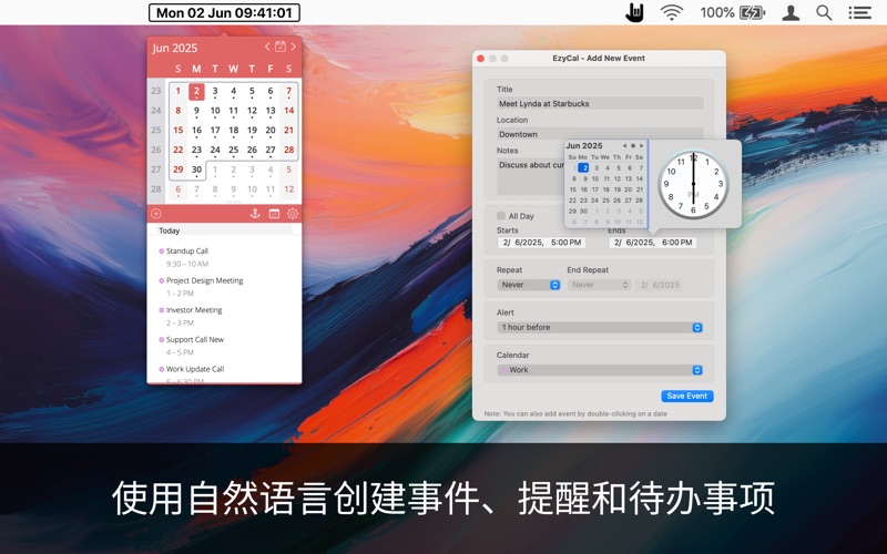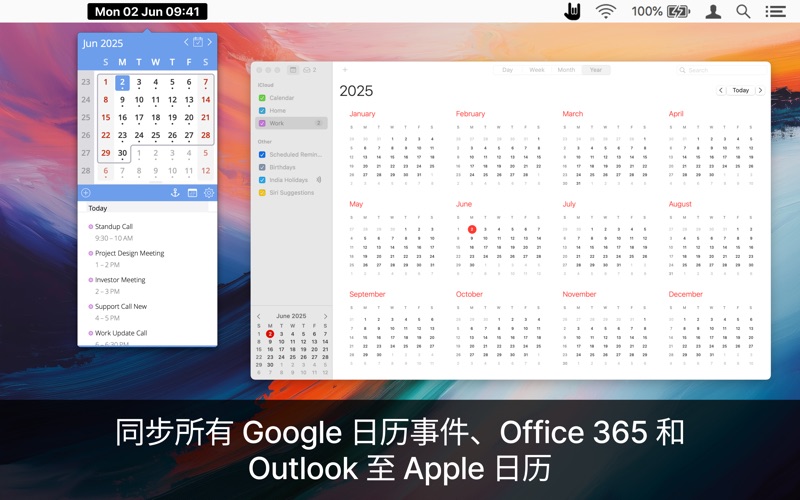EzyCal日历是一个为社交,宗教,商业或行政目的组织日子的系统。 这是一个阳历,具有自然语言事件和提醒创建,美丽的日历视图,以及您将使用的提醒应用程序。 ≈ 特征:≈ ◉ 添加事件,提醒,待办事项列表。 ◉ 倒计时让您保持正轨。 ◉ 与系统日历事件同步。 ◉ 获取今日扩展中的事件列表。 ◉ 24小时制AM&PM。 ◉ 不同语言的日历。 ◉ 各种屏幕尺寸的不同尺寸 ◉ as根据需要自定义键盘快捷键 ◉ 与Mac上的所有可用日历同步。 ◉ 在接下来的7天内在单个显示中获取事件列表。 ◉ 与日历交互的简单用户界面。 ◉ 不同的颜色主题 ◉ 暗模式支持 EzyCal可与MacBook_Air,MacBook Pro,iMac,MacBook,MacPro,Mac-Mini配合使用。 ≈ 应用偏好:≈ ◎ 状态栏图标:显示月,日,周,时间,自定义要求。 ◎ 键盘快捷键:记录快捷键,需要在状态栏中打开日历。 ◎ 主题:根据需要选择主题颜色。 ◎ 窗口大小:根据不同的屏幕尺寸选择三种不同尺寸的日历窗口 如果您有任何问题或建议,请联系support@appyogi.com。我们一直致力于改进我们的应用程序并添加客户要求的有用功能! ■■■ 感谢使用EzyCal ■■■ ◎支持最新的macOS Ventura。 ◎提高了性能 ◎错误修复。 如有任何问题、建议或bug,请发邮件给我们:support@appyogi.com。我们希望听到你的想法,并对这个应用程序的未来版本进行改进,让你满意。我们计划在你的爱和支持下进行积极的更新! 每一点都有帮助! :)