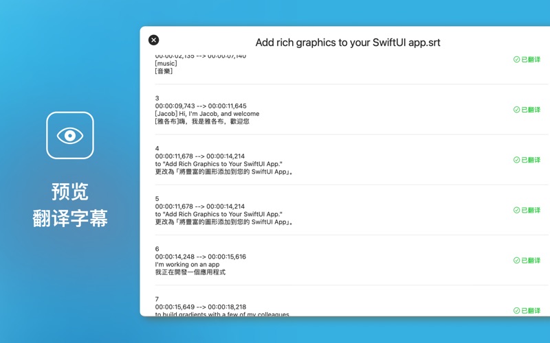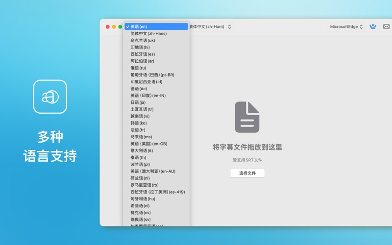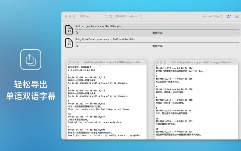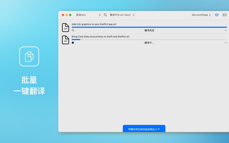 字幕翻译助手 是一款强大且高效的Mac应用,专为处理和翻译SRT字幕文件而设计。无论您是电影制片人、视频编辑还是多语言学习者,这款应用都能大大提升您的工作效率,轻松实现字幕的批量翻译和导出。 主要功能 1. 批量导入SRT文件: - 支持一次性导入多个SRT字幕文件,无需逐个添加,节省您的时间和精力。 2. 一键翻译: - 借助谷歌翻译和微软翻译的强大技术,您可以将字幕内容一键翻译成多种语言,覆盖全球观众。支持多种主流语言的翻译,让您的视频内容更加多元化和包容性。 3. 单语字幕导出: - 翻译完成后,您可以选择导出单语字幕文件,方便直接使用在您的视频项目中。 4. 双语字幕导出: - 提供双语字幕导出功能,让学习者或多语言观众更容易理解和学习不同语言。字幕文件将包含原文和翻译内容,呈现双语对照效果。 5. 双语字幕单独导出: - 支持将双语字幕分别导出成单语字幕文件,便于独立使用和多种场景需求。 6. 用户友好的界面: - 简洁直观的用户界面,操作简单易上手,即使您是第一次使用此类软件,也能快速掌握。 适用人群 - 电影和视频制片人: - 快速翻译和导出字幕,提高影片多语言版本的制作效率。 - 视频编辑人员: - 轻松管理和处理多个字幕文件,提升工作效率。 - 语言学习者: - 通过双语字幕功能,更高效地学习和掌握外语。 - 多语言视频创作者: - 扩展您的观众群体,让更多人能够理解和欣赏您的内容。 字幕翻译助手 是您的理想字幕翻译助手,凭借其强大的功能和友好的界面,将字幕翻译和导出变得前所未有的简单和高效。无论您是专业视频制作者还是语言爱好者,这款应用都将成为您工作和学习中的得力工具。 立即下载字幕翻译助手,开启您的多语言字幕之旅吧! 更新说明: 1. 优化了导入过程中出现的卡顿问题。 2.修复了处理多行字幕时的识别异常问题。