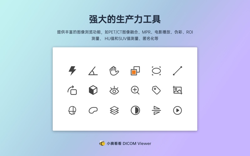 小赛看看DICOM Viewer是一款简单好用、免费的医学影像DICOM阅片软件。 轻轻一拖,呈现专业影像 • 将DICOM文件拖入软件,即可打开影像 • 支持符合DICOM标准的医学影像,包括CT、MR、DX、XA、US、PT、NM、SR、SC等 强大的生产力工具 • 提供丰富的图像浏览功能,包括MPR、3D浏览、电影播放、伪彩、ROI测量、 HU值和SUV值测量、匿名化等 • 专业的核医学图像融合功能,支持SPECT/CT、PET/CT、PET/MR融合 一键生成视频,轻松分享 • 一键将屏幕所见生成mp4视频或者png图片,方便您分享关键发现 让工作走出办公室 • 可以在Windows、macOS电脑上自由使用,随时随地查看影像 官网:beedicom.com 微信公众号:小赛核医学 微信视频号:小赛看看 客服邮箱:service@beedicom.com 您遇到任何问题,请通过微信公众号联系我们 详细的软件使用教程,请关注微信视频号 1. 支持ROI复制 2. 数据列表显示缩略图