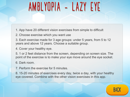弱视,也称为懒惰眼,是一种视力障碍,因为眼睛和大脑不能很好地配合。这会导致眼睛视力下降,否则通常会显得正常。这是儿童和年轻人中单眼视力下降的最常见原因。 弱视-懒惰的眼睛-视力锻炼可帮助改善和解决此问题。 如何使用: 1.应用程序有20种不同的视觉练习,从简单到困难 2.选择您要使用的运动 3.每次锻炼分为3个年龄段:5岁以下,5至12岁和12岁以上。选择一个合适的组。 4.遮盖健康的眼睛。 5.根据屏幕尺寸,离屏幕1或2英尺的距离。练习的目的是使您的眼睛在眼窝周围移动。 6.黑暗的房间。 7.锻炼5分钟。 8.每天进行两次15至20分钟的运动,每天两次,并盖好健康的眼睛。结合这个程序中的其他视觉练习。 只要视力改善,就继续治疗。如果没有继续改善,则不值得继续修补超过6个月。 练习顺序的一些小改进