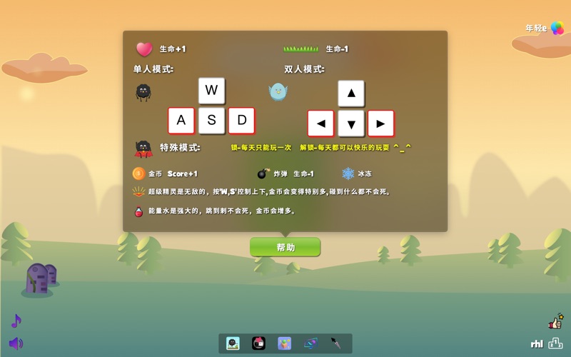 控制可爱的精灵跳到板上,不要碰到刺,不要跳下去,吃更多的生命来加分数,下去的越深分数越高,你的分数将会传到排行榜上,与全世界的小伙伴一起争第一吧!有趣! 单人模式:挑战高分榜。 两人模式:有趣双排,与好朋友分享快乐。 加入GameCenter成就系统