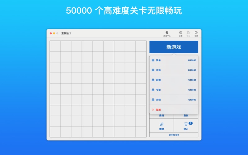 【快捷键】 输入数字:1~9 删除:删除键 提示:H 撤销:Cmd+Z 重做:Cmd+Shift+Z 暂停/继续:空格键 移动:上/左/下/右 现在你对数独有了一些了解,尽情玩耍并享受这款免费游戏吧。 本次更新修复了在 macOS 26 上出现的一些兼容性问题,并提升了整体稳定性与性能。