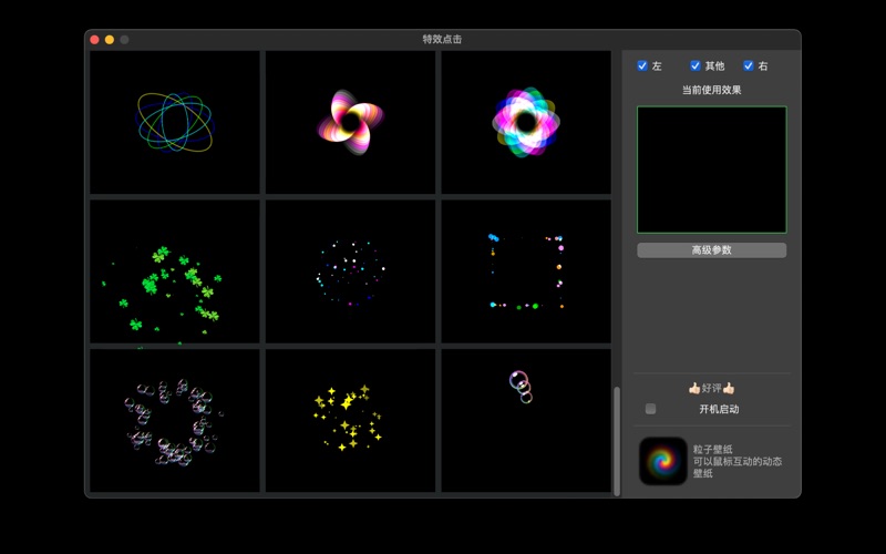 特效点击-非常酷的鼠标点击特效,多种特效可供选择,不断更新。 1. 只需从列表中选择即可使用。 2. 选择“左”“右”“其他”。 添加效果 bug修复