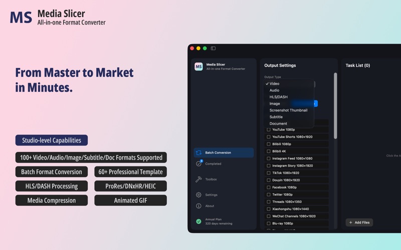 # Media Slicer - macOS专业媒体转换与母版导出工作室 为内容创作者、专业人士和日常用户打造的终极一站式媒体制作工具。在所有主流平台上准备和交付视频、音频、图像和文档。 ## 创作者母版导出 使用70多个专业校准的模板交付广播级内容。直接按平台规格导出。 ### 视频模板 YouTube (4K, 1080p, Shorts)、TikTok、抖音、Instagram (Feed, Story, Reels)、Bilibili、Facebook、Twitter、Threads、小红书、微信视频号、Netflix、Blu-ray、Cinema DCI ### 音频模板 播客标准和HD、有声书、音乐标准和无损、Spotify、Apple Music、YouTube Music、SoundCloud、广播电台、Studio Master ### 图像模板 社交媒体优化封面和缩略图、印刷就绪格式(CD封面、DVD封面、专辑封面、A4、海报)、标准宽高比(1:1、16:9、9:16、4:3、21:9) ## 文档转换 在PDF、Word、Markdown、HTML、LaTeX、EPUB等30多种格式之间转换文档,支持可选目录生成。 ## 专业模式 高级编码选项:视频编解码器(H.264、H.265/HEVC、VP9、AV1、ProRes)、音频编解码器(AAC、MP3、FLAC、Opus、PCM、ALAC)、帧率、像素格式、编码预设、音频声道(单声道、立体声、5.1环绕声)、图像控制(色彩空间、滤镜、位深度) ## 内置专业工具 媒体信息分析器、在线质量保证 ## 流媒体格式支持 可配置分段的HLS和DASH转换。流媒体与标准格式之间的双向转换。 ## 通用格式支持 视频:MP4、MOV、AVI、MKV、WebM、FLV、WMV、TS、GIF 音频:MP3、M4A、AAC、FLAC、WAV、OGG、Opus、WMA 图像:JPG、PNG、GIF、BMP、WebP、TIFF、HEIC、AVIF、ICO 字幕:SRT、VTT、ASS、SSA 文档:PDF、DOCX、HTML、Markdown、LaTeX、EPUB、ODT、RTF ## 为什么选择Media Slicer 平台完美交付:模板按照YouTube、TikTok、Instagram、Bilibili、Netflix和广播标准的精确要求校准。 一键专业输出:选择模板,拖放文件,导出。分辨率、码率、编解码器和格式自动处理。 优化性能:针对Apple Silicon优化的原生算法,完全兼容Intel。 直观设计:拖放式简洁界面。日常使用的快速模式,完全控制的专业模式。 完全隐私:完全离线工作。您的媒体永远不会离开您的Mac。 批量处理:实时进度跟踪和持久队列,可将多个文件加入队列。 ## 适合人群 内容创作者、播客主、音乐人、视频专业人士、社交媒体经理、作家、研究人员、开发者以及任何需要可靠媒体转换的人。 ## 多语言支持 完全支持21种语言,包括英语、西班牙语、法语、德语、葡萄牙语、俄语、阿拉伯语、日语、韩语、简体中文、繁体中文等。 下载Media Slicer,掌握您的媒体工作流程。 本应用使用Apple标准使用条款(EULA)。 更多信息:https://www.apple.com/legal/internet-services/itunes/dev/stdeula/ **重大更新 - 全新设计与新功能** **文档转换** - 新增:支持PDF、Word、Markdown、HTML、LaTeX、EPUB等30+格式文档转换 - 可选目录生成 **一键导出模板** - 新增:60+视频、音频、图片专业级模板 - 视频:YouTube、TikTok、Instagram、Bilibili、Netflix、Blu-ray、Cinema DCI - 音频:播客、有声书、音乐、Spotify、Apple Music、Studio Master - 图片:社交媒体封面、缩略图、印刷格式、标准比例 **专业模式** - 新增:高级编码控制 - 视频编码器、帧率、像素格式、编码预设 - 音频编码器、采样率、声道配置 - 图片色彩空间、滤镜、位深度 **转换功能增强** - 改进视频、音频、HLS/DASH、图片、字幕转换 - 更多可调参数和自定义选项 **制作工具箱** - 媒体信息分析器 - 在线质量检测 **全新界面设计** - 现代化UI,支持收起侧边栏 - 优化工作流程 **语言支持** - 新增11种语言(共21种) **优化改进** - 内核引擎升级 - Bug修复与稳定性提升