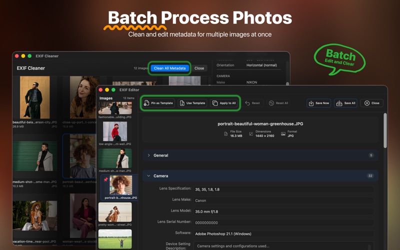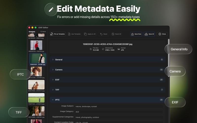 全新一体化 EXIF 查看器/清理器/编辑器现已发布。支持 M1/M2/M3/M4,已在最新 macOS 上全面测试。 AnyEXIF 是一款专业且易于使用的工具包,用于管理、编辑和清理照片元数据。保护您的隐私,整理您的照片集,并全面掌控 EXIF、GPS、IPTC 和 TIFF 信息——所有功能都集中在一个强大的应用程序中。 1. EXIF 清理器 轻松删除私密敏感的 EXIF 数据,包括 GPS 位置、相机型号、镜头信息和时间戳。在线分享照片,无需担心个人信息泄露。 2. EXIF 查看器和检查器 查看和分析图像中完整的元数据详细信息,包括曝光、焦距、ISO 等——是摄影师和专业人士的理想之选。 3. EXIF 元数据编辑器 编辑、重写或重置超过 150 种类型的 EXIF、IPTC、GPS 和 TIFF 元数据。精准修正错误数据或添加缺失信息。 4. GPS 数据修改器 修改、删除或为您的照片分配新的 GPS 坐标。非常适合在分享前修正不准确的位置标签或匿名化照片。 5. 照片管理器 使用内置元数据工具预览、整理和管理您的照片库。快速查看照片详情并批量处理文件,实现高效的工作流程。 非常适合 想要分析和编辑 EXIF 信息的摄影师。 任何需要在在线分享前删除敏感位置信息或相机信息的用户。 想要整理和清理大型照片库的用户。 特征: ** 支持编辑各种元数据格式:General/EXIF/GPS/IPTC/XMP/TIMESTAMP/CAMERA/LENS/FLASH/GPS & More。 ** 支持预览所有可能的图像格式:TIF/EXR/PSD/CR2/PSB/PPM/HDR/TGA/PBM/HEIC/WEBP/PNG/JPG/DNG/DDS/BMP/JP2/ICO/PGM/GIF。 ** 支持编辑和删除批量照片元数据。 ** 支持更改 GPS 坐标并为您的照片设置新位置。 ** 支持通过预览、删除和在预览中打开来管理照片。 ** 支持通过拖拽添加文件夹来导入所有照片。 ** 添加标志以突出显示特殊照片。 ** 通过我们精心设计的简单界面,快速、可靠且易于使用。 ** 通过单独或分组选择文件来编辑和清理元数据信息。 标签和元数据 - 一般:艺术家、描述、版权、软件、创建日期时间、相机设备、相机设备型号、计算机系统。 - 相机:设备设置说明、F 值、快门速度、光圈、最大光圈、焦距、光谱灵敏度、iSO、被摄体距离、测光模式、被摄体区域、被摄体位置、感应方式、场景类型、数码变焦比、焦距35mm 格式的长度、场景捕捉类型、主体距离范围。 - 镜头:镜头规格信息、镜头制造商、镜头型号、镜头序列号、镜头信息、镜头型号、序列号、镜头 ID、镜头序列号、闪光补偿、镜头所有者名称、固件信息 - FLASH:Flash Pix 版本,Flash 能量 - TIFF:光度解释、传递函数、照片方向、X 分辨率、Y 分辨率、分辨率单位、白点、原色 - EXIF:原始日期和时间、数字化日期和时间、曝光时间、曝光程序、曝光指数、曝光模式、曝光 iSO 速度、推荐曝光指数、曝光偏差值、灵敏度类型、标准输出灵敏度、合成图像的曝光时间、滤色器阵列图案、亮度、光源、闪光状态、对比度、饱和度、锐度、伽玛、白平衡、UniqueID、每像素压缩位数、色彩空间、X 维度、Y 维度、图像文件源。 -GPS:GPS纬度,GPS纬度参考,GPS经度,GPS经度参考,GPS高度,GPS高度参考 - IPTC:图像主题、图像类别、补充类别、关键字、内容位置代码、内容位置名称、图像类型、图像方向、图像描述、图像摘要描述、信用、星级、场景、版权声明, 使用条款, 发布日期, 发布时间, 失效日期, 失效时间, 使用图像的特殊说明, 图像创建者姓名, 图像创建者的标题, 图像的原始所有者, 联系信息, 作家或编辑姓名, 创建者的联系信息, City, Sub-location, Province-State, Country-Primary Location code, Country-Primary Location Name, Orignal Transmission Ref, Originating Application., Application Version., 对象类型, 对象属性, 对象名称 订阅 免费使用所有功能。升级到专业版即可同时清除、编辑和导出 5 张照片的元数据。 月费套餐:6.99 美元 - 无限使用 年费套餐:19.99 美元 - 超值优惠 终身套餐:29.99 美元 - 一次付费,永久使用 联系 网址:https://anyexif.com/ 电子邮件:support@anyexif.com 隐私:https://anyexif.com/privacy.html 条款:https://anyexif.com/terms.html 1. 新增两个元数据复制选项,提升灵活性 • 选项 1:使用模板照片中的所有有效元数据(跳过空字段)。 • 选项 2:仅使用模板照片中已编辑的元数据。 2. 优化 EXIF 编辑的用户体验