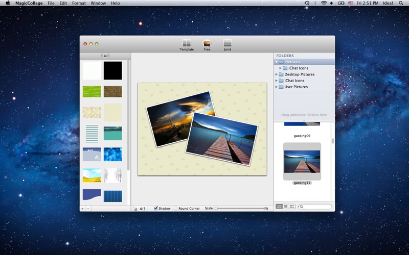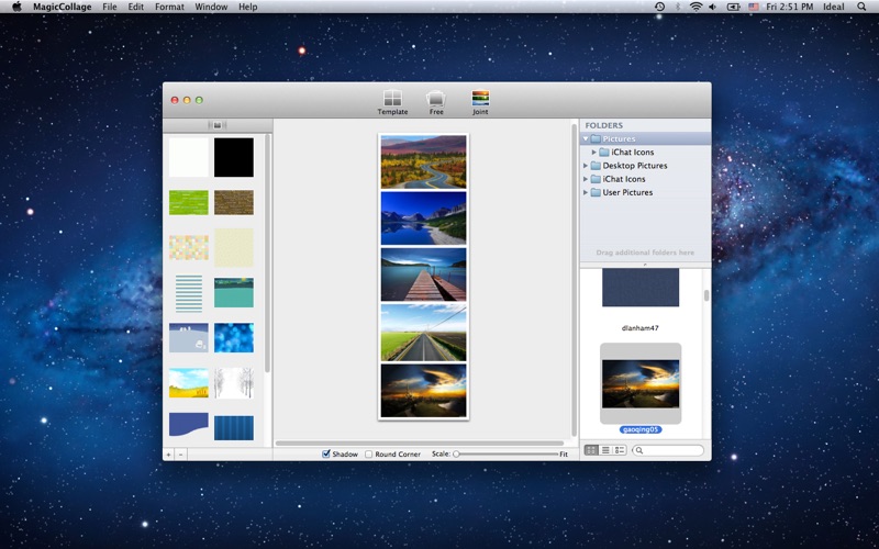 魔力拼图是一个易用、功能强大的拼图软件,它能轻松的把你的多幅照片拼接成一幅完整图片的工具。 ※ 提供3种不同的照片拼接方法 ※ 提供超过40种常用的拼接模板 ※ 任意修改模板画布的比例 ※ 使用自己的图片作为画布背景 提供的3种拼接方法: 1. 模板拼图,魔力拼图提供了20多种不同的拼接模板,用户只要把照片从硬盘或程序右边的图片列表里拖入模板里,就可以组合出自己想要的拼图。而且,我们会不断提供新的模板给用户下载。 2. 自由拼图,你能把照片放在画布的任意位置,并且设定任意的角度。 3. 拼接图片,只要把图片拖入画布,魔力拼图就可以把他们一张张的连接在一起,形成一个超长的图片。 * Lite版本限制 * 1. 每个模板最多4张图片 2. 图片拼接模式最多5张图片 3. 不能自定义输出图片尺寸 4. 选择Pro模板时只能使用小尺寸保存图片 新功能: 在”自由拼图“模式下,用户可以调整图片的显示设置,包括边框、阴影、填充色等! 修复Bug:在Retina屏幕下,调整画布比例的窗口尺寸错误