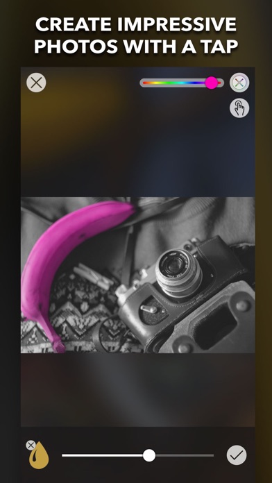 It's super quick and super easy. No finger painting is needed! All you have to do is tap on the color you want to highlight! Depello makes it possible to create stunning and effectful grayscale images with just a tap. Depello is a photo editing tool which converts your images and photos into black and white but preserves and highlights a color of your choice using state of the art computer vision algorithms. Make that red apple stand out among all the green ones! The user interface is easy to use with minimal controls for smooth navigating and pinch to zoom features etc. Want to create amazing looking photos with the tap of a finger? Look no further, Depello is the app for you! It's the best and easiest colorsplash / colorpop / recolor tool in the App Store! WHY USE DEPELLO: • Color splash/Color pop any image and and start highlighting colors • Pinch to zoom and just tap the color of your choice • Peek and pop with full 3D-touch supports on app icon and in image album • Stay creative on iPhone, iPad and your Mac! Depello supports them all! • Tell the world about your latest creations on Instagram and Facebook PREMIUM FEATURES: • Change the color of the highlighted color. Make that yellow banana turn red! • Draw with your fingers to manually make some parts of the photo into black & white. Questions? Problems? Ideas? Please get in touch: info@northmind.io Thanks for all your feedback and support. This version updates the image picker to support picking photos from albums!