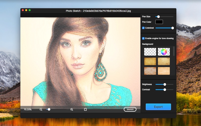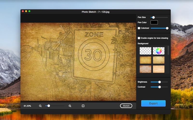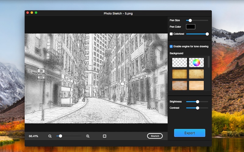 Photo sketch 是一款采用了最先进的算法为素描美术爱好者打造的专业软件,他能将你的照片转变成高质量的铅笔素描,还可以生成透明背景的线条描边图,让用户根据自己的想法去进一步创作。 主要特点: -支持启动引擎进行色调绘制; -可以实时显示效果; -可以保存原图大小,保持高分辨率; -支持采用原图颜色着色; -可以更改笔的颜色; -可以更改笔的大小; -可以更改背景颜色; -可以生成透明背景线描图,方便保存后进一步自由创作; -提供超过20种不同的纸张背景; -可以调整图片亮度和对比度; -原图和效果图可以随时切换显示; -Photo Sketch 支持多种格式图片导入和导出。 修复一些小问题
