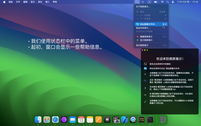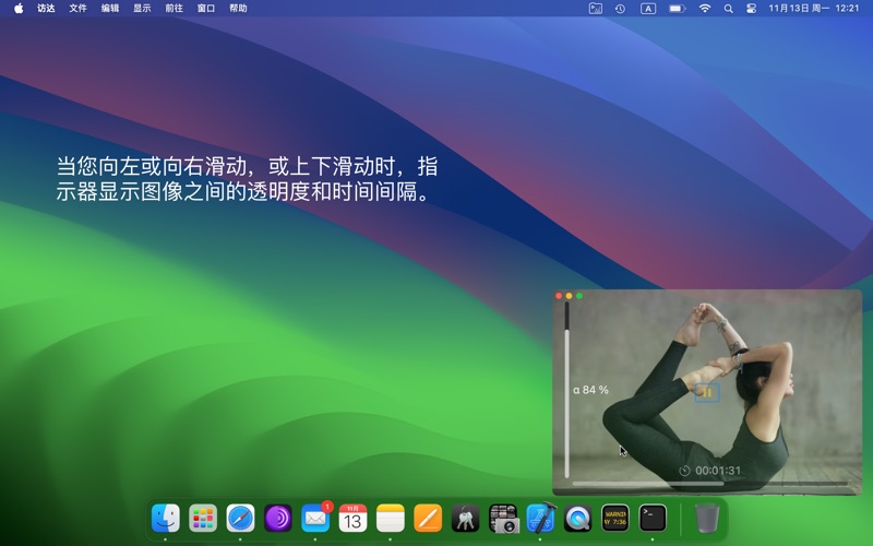 如果您拥有一组令人鼓舞的图像,希望随时在屏幕旁边看到,那么我的应用程序是您的理想选择。 主要特点: • 图像始终位于其他窗口之上,保持半透明状态。 • 事件透明:当图像窗口处于非活动状态时,它会将鼠标和键盘事件传递给底下的窗口。 • 支持播放列表中的多个文件夹。 • 图像会自动更换,或您可以使用键盘暂停并前后导航。 • 轻松的手指移动可以自定义透明度和间隔。 • 调整窗口以缩放图像。 • 在访达中发现有趣的图像。 • 访问您的照片库中的所有照片。 现在透明度可以从 0 调整到 100%(之前是 10 到 100%)。 现在可以使用光标控制键调整透明度和间隔。