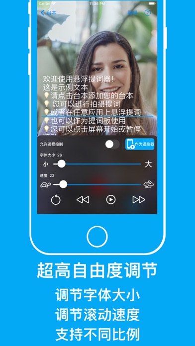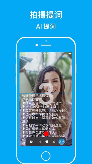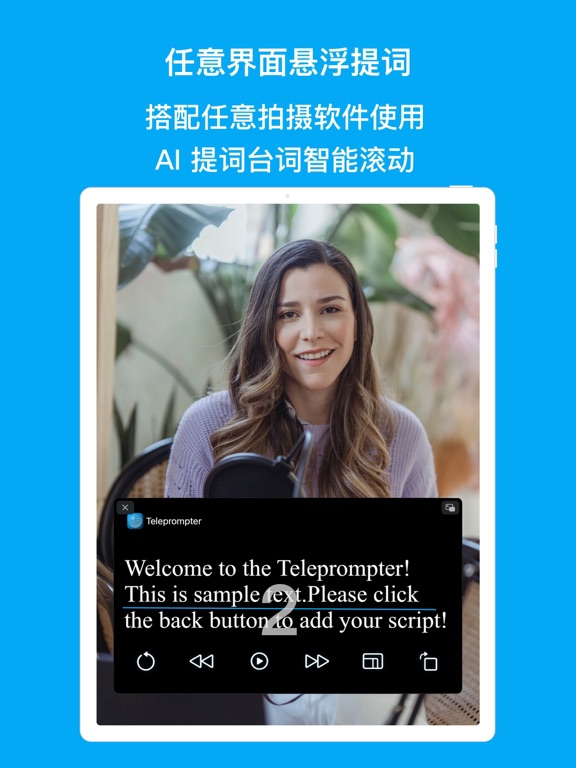 悬浮提词器是一款便捷的提词工具,可以在任意APP前面展示台词文案,不仅是个提词器,还能当做悬浮便签备忘录使用。 搭配任意录制软件,无需纠结录制、美颜效果,搭配你最喜欢的录制软件进行录制。 方便vloger,youtuber,up主,口播和直播主播使用的文案神器,从此台词一遍过。 特色: # 可在iPhone,iPad和Mac上使用 # 支持视频录制 # 支持远程控制 # 支持脚本导入与iCloud同步 # 支持灵动岛和实时活动控制 # 可在任意APP界面悬浮展示文案,在相机界面也能顺畅使用 # 台本列表,添加并保存自己的台词台本 # Apple Watch 控制 # 多种比例选择 # 多种字体选择 # 悬浮窗缩放和位置调整 # 支持横竖屏切换以及全屏展示 # 复制粘贴文本 # 字体大小调节 # 滚动速度调节 # 字体颜色调节 # 背景颜色更改提高辨识度 # 自定义主题 无限访问订阅 - 您可以订阅无限访问 提词器App 的所有付费功能和内容。 - 订阅按月或按年收费,价格取决于选择的订阅套餐。或者,选择一次性付款购买(非订阅)。 - 订阅自动按所选套餐价格续订,除非在当前订阅期提前 24 小时取消。订阅费在您确认购买时通过 iTunes 帐户收取。购买后,您可以前往帐户设置,管理订阅和关闭自动续订。根据 Apple 的政策,在活动订阅期内不能取消当前订阅。