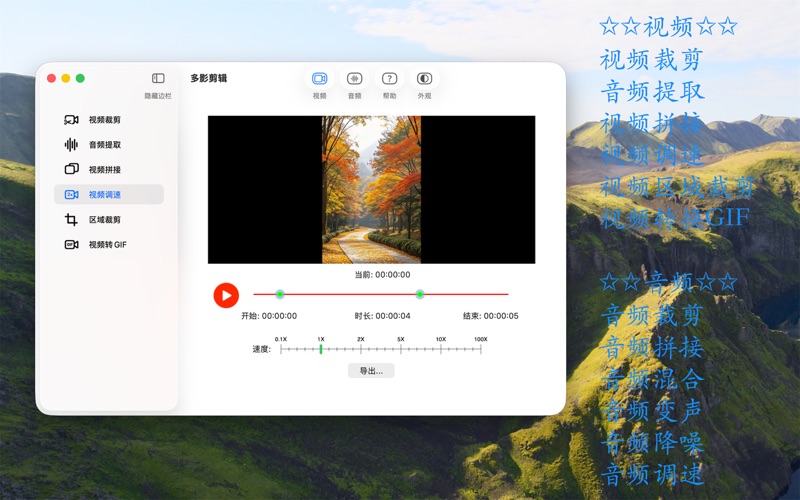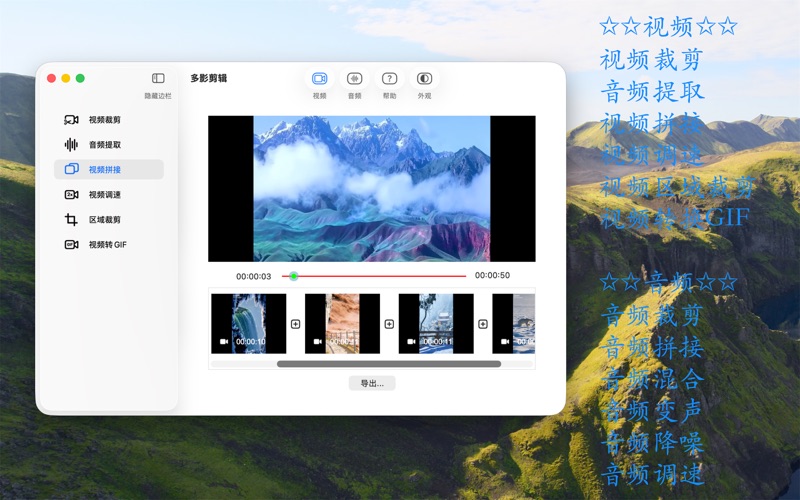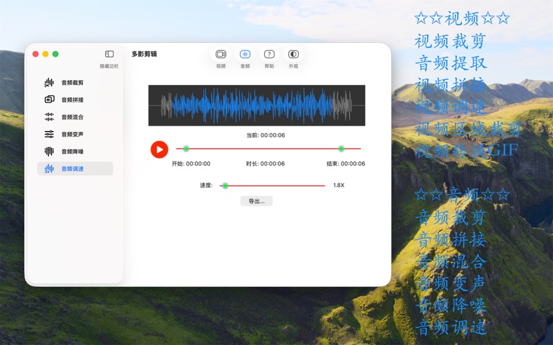 轻松并快捷的剪辑音频和视频。 极简的操作界面,让处理音频和视频不再复杂。 **** 视频处理 **** 1. 视频裁剪。 2. 音频提取。 3. 视频拼接。 4. 视频调速。 5. 区域裁剪。 6. 视频转GIF。 **** 音频处理 **** 7. 音频裁剪。 8. 音频拼接。 9. 音频混合。 10. 音频变声。 11. 音频降噪。 12. 音频调速。 以下功能需要升级后才能使用。 • 音频变声。 • 音频降噪。 • 音频调速。 • 视频调速。 • 区域裁剪。 • 视频转GIF。 修复了一些问题,提升了整体稳定性。