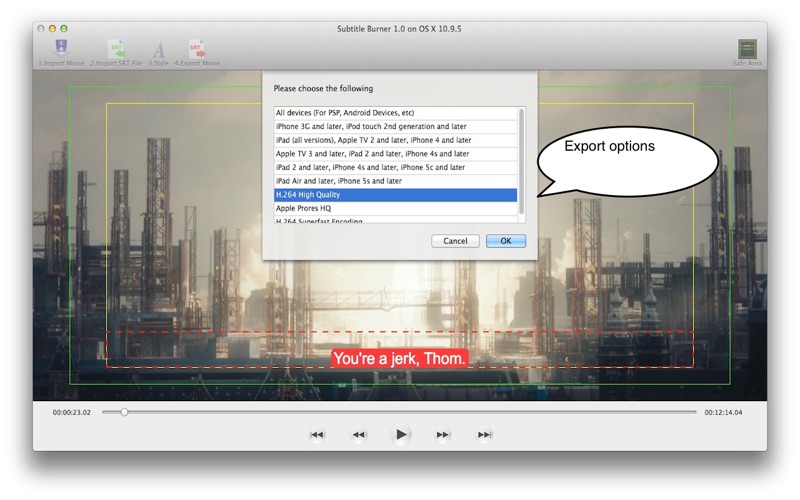 有两种带字幕的视频方式,一种是软字幕,一种是硬字幕。 软字幕类似在视频里有一个单独的字幕轨,在一些主流的播放软件里可以切换显示或不显示字幕,但有些播放软件则不能。字幕显示到视频上的时候,字幕的字体/大小/颜色等都是由播放器决定的。这种软字幕不会损失画质,但经常出现播放器不兼容的情况,导致字幕不能显示。 硬字幕则是把字幕永久性地烧入视频,播放软件不能设定不显示字幕。这种字幕与播放器无关,您可以在烧入字幕的时候决定字幕的属性,比如位置/大小/字幕/颜色/背景颜色等等。但是把字幕烧入到视频会导致画质略有损失。 Subtitle Burner字幕烧制器是为您烧制硬字幕的工具软件。 --支持Mov, MP4, M4V, MKV, AVI, 3GP, MPG等视频格式。不支持有版权保护的M4V。 --只支持SRT标准的字幕。如果您有其他的字幕格式,您可在App Store里下载SRT Converter来转换字幕格式。 --可视化地拖动字幕框来设定字幕的位置。 --字体/大小/颜色/位置/边框/背景颜色/背景框等的设定。 --支持所有macOS支持的语言。 如果您在购买或使用时遇到任何问题,请随时写邮件联系我们:helloliubin@gmail.com --如果您要为视频写入软字幕,请下载 Subtitle Writer. --如果您要把SRT字幕导入到Final Cut Pro,请下载Final SRT. --如果您要把SRT字幕导入到Adobe Premiere Pro CC 2016或更新版本,并作为Essential Graphics类型的字幕,请下载Pr Titles --如果您要把SRT字幕导入到Adobe Premiere Pro CC 2015或更旧版本,并作为PRTL类型的字幕,请下载Premiere SRT. --如果您要把Pr或者Final Cut Pro 7/X里面的字幕导出为SRT文件,请下载XML2SRT。 --如果您想创建或编辑SRT字幕文件,请下载Subtitle Edit Pro或SRT Edit Pro 一些bug修复
