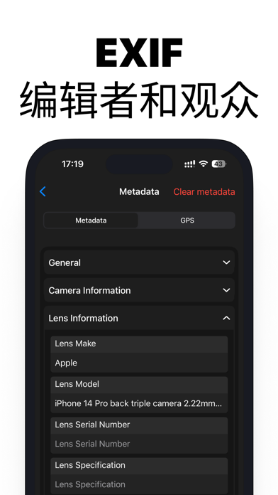 Exif Editor – 全功能照片元数据编辑器 全面编辑、查看与清理照片的 EXIF 元数据。 支持修改日期、时间、相机型号、镜头信息、曝光、ISO、GPS 定位等所有常见字段。 可进行批量处理,轻松管理您的照片信息。 主要功能: - 编辑日期与时间调整或纠正照片的拍摄日期和时间。 - 修改相机与镜头信息可更改相机品牌、型号、镜头、曝光值、光圈、快门速度、ISO 等。 - GPS 定位编辑添加、修改或删除照片的地理位置信息。 - 批量处理同时编辑多张照片的 EXIF 数据,高效便捷。 - 隐私保护去除敏感元数据,在分享照片前保护隐私。 - 广泛格式支持支持 JPG、TIFF、HEIC 等主流格式。 适合人群 摄影师、设计师、影像工作者,以及任何需要全面控制照片信息的用户。 为什么选择 Exif Editor - 完整支持 EXIF 所有关键字段。 - 简洁直观的界面,专为 iOS 优化。 - 所有操作均在本地完成,确保数据安全。 全面掌控您的照片元数据,从相机到定位,一键编辑。 Term of use: https://sites.google.com/view/exifeditortool-termsconditions/ 全新的 2.0 版本来了! 我们完全重新设计了应用,让 EXIF 标签编辑更加简单直观: • 全新的现代化界面 • 全面升级的标签编辑机制 • 更高的稳定性和性能优化