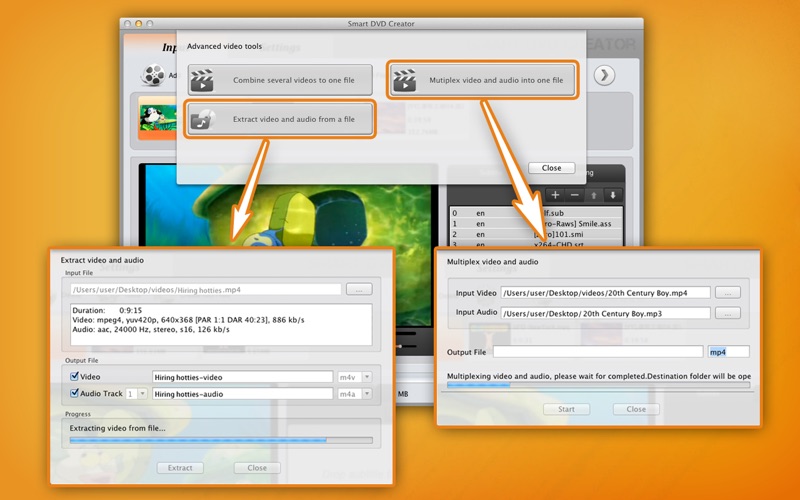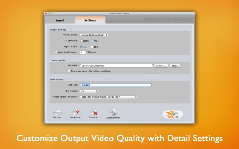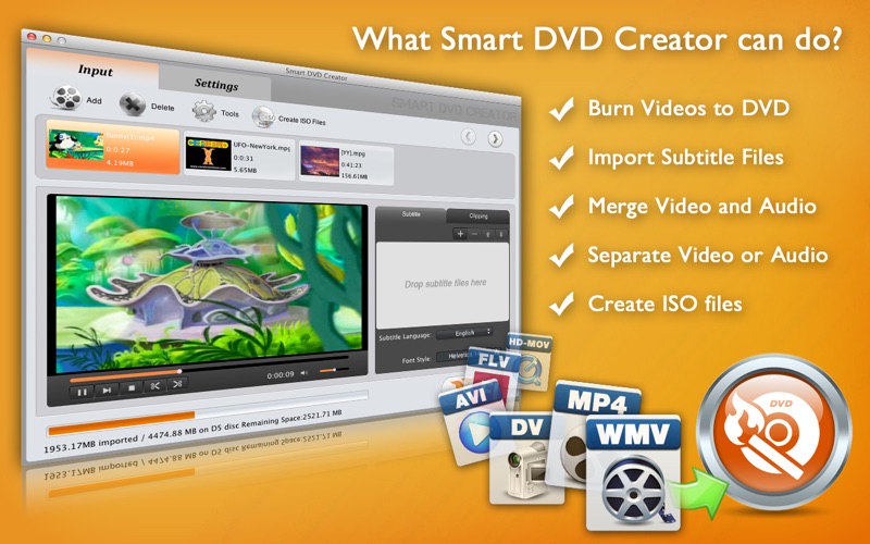 Smart DVD Creator是一个强大但是简单易用的DVD刻录工具,能够轻松地刻录视频到DVD光盘或者生成ISO文件。支持主流视频格式:MP4, AVI, MKV, MPG, MPEG, WMV, MOV, FLV, AVCHD... 现在你可以随时享受你的DVD盘中的电影啦! 主要特点: 1 刻录流行的视频格式,包括MP4, MKV, FLV, AVI, MPEG, DivX, DV, WMV到DVD。 2 支持高清(AVCHD, HD-MOV, HD-MKV, HD-WMV)视频输入。 3 搜索并连接您的数码相机,摄像机或手机从而导入视频短片DV(AVCHD,MOD,TOD)。 4 支持添加字幕,字幕格式包括.srt .sub .ass .smi 等。 5 快速视频剪辑功能。 6 按照您的要求定制输出的视频质量。一张DVD 5可以刻录长达8个小时的视频。 7 视频预览功能:在DVD刻录之前您可以先预览总体效果。 8 生成ISO文件,如果您不想直接刻录到DVD,可以以ISO格式存储等待以后刻录。 反馈: 任何建议将不胜感激,支持电子邮件:etvcmac@gmail.com * 感恩回馈,全功能“视频编辑大师专业版”,限时7折优惠。 * 赠品:凡今日购买“超级转霸DVD刻录版”的用户, 将会免费得到一份价值200元的"超级播霸升级版 Total Video Player Pro"的注册码,世界排名第一的蓝光播放器,流畅播放4K 高清电影。只有今天购买“超级转霸DVD刻录版”的才能享有,而不是“Smart DVD Creator”哦。请发邮件及购买记录到market@effectmatrix.com 获取免费注册码。 * 兼容 Mac OS Yosemite
