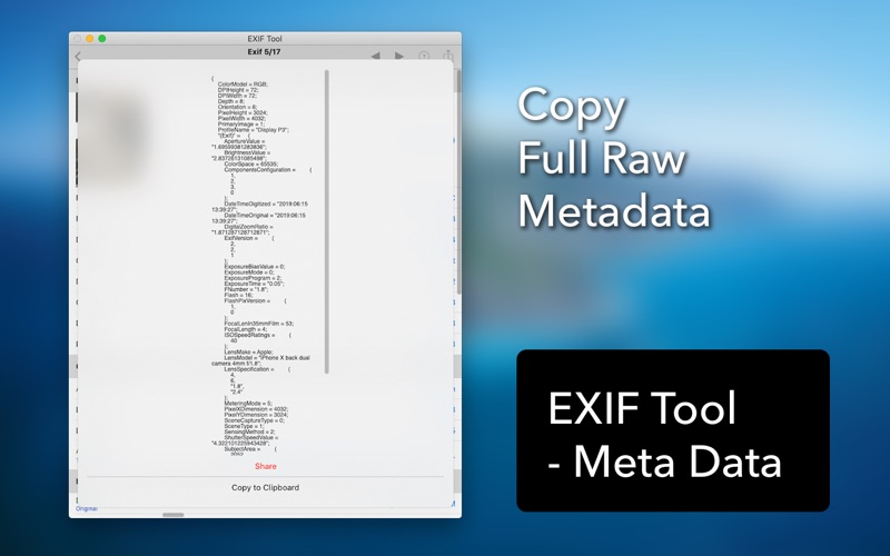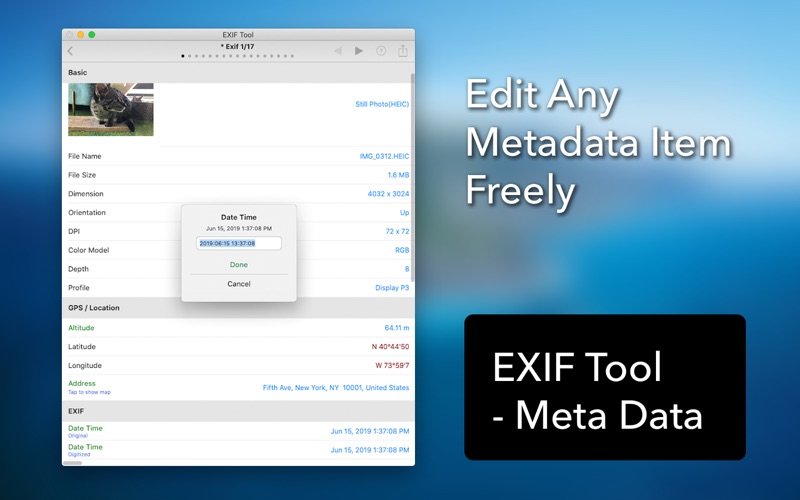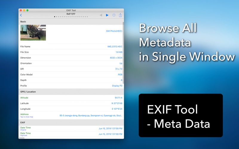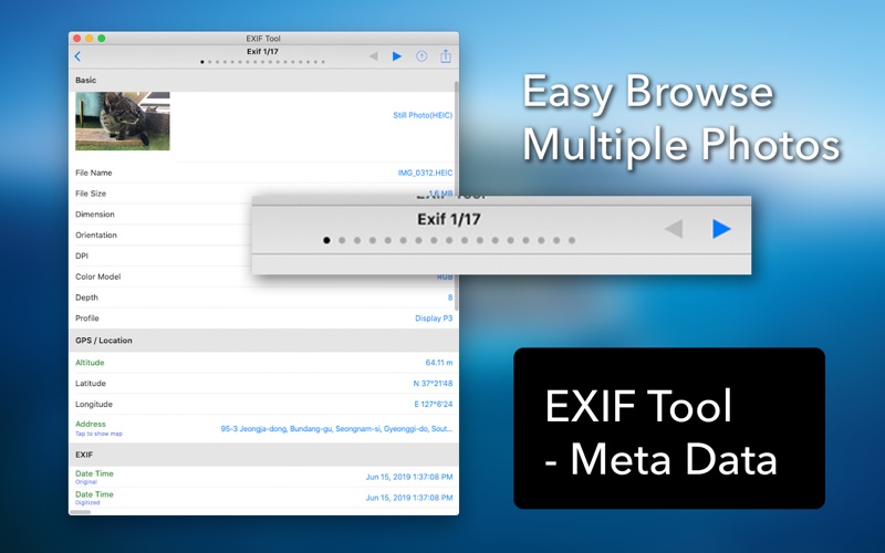[EXIF Tool]是适用于您的照片和视频的功能最强大的EXIF和元数据工具。 您不仅可以从Finder导入图片文件,还可以从照片库导入图片文件。 它还完美支持拖放。 它支持所有图像格式,包括heic,jpg,png和gif。它也支持视频。 对于那些担心隐私的人来说,[Exif浏览器]可让您从照片中去除EXIF和元数据。您可以选择是删除所有元数据还是仅删除GPS /位置数据。 如果需要,您还可以编辑每个元数据项。 • 从Finder导入照片和视频。 • 从相册导入照片和视频。 • 通过拖放导入照片和视频。 • 还支持强大的照片浏览和查看功能。 • 显示基本信息: file name, file size, dimension, orientation, duration, ... • 显示详细的EXIF信息: date time, aperture, brightness, fNumber, shutter speed, focal lenght, ISO speed, exposure, flash, lens, camera, software, ... • 显示GPS /位置信息: altitude, latitue, longitude, human-readable address, map, ... • 显示GIF信息: delay time, loop count, ... • 支持所有格式,包括heic,jpg,png,gif,现场照片和视频。 • 编辑每个元数据项目。 • 删除所有元数据后共享照片。 • 与GPS /位置移除共享照片。 • 显示原始数据。 - Minor UI enhancements and bug fixes.