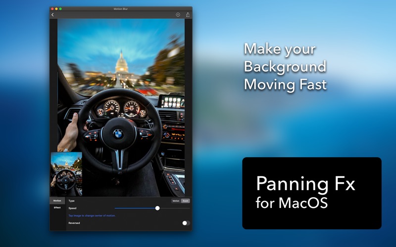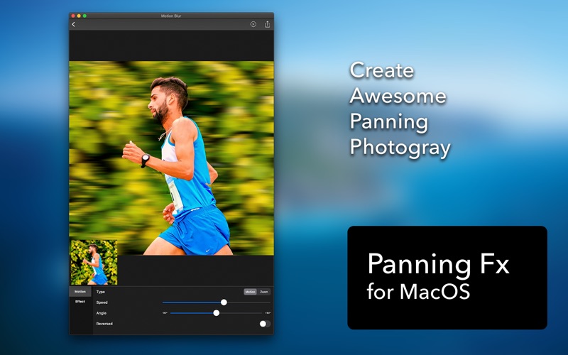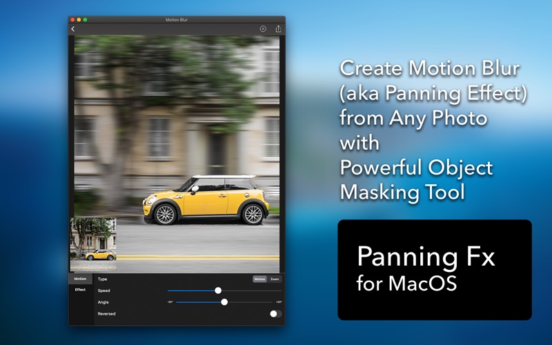 借助[运动模糊]提供的强大的对象蒙版工具和众多的运动模糊选项,您只需一步就可以将普通照片变成令人惊叹的摇摄照片(又名运动模糊照片)。 您可以一步一步制作平移摄影作品,例如跑步者,汽车,摩托车,地铁和宠物。 • 支持超级智能对象遮罩。 • 支持运动模糊和缩放模糊。 • 您可以调整运动模糊的速度。 • 您可以调整运动模糊的角度。 • 您可以调整运动模糊的中心。 • 支持反向运动模糊。 运动模糊可以应用于对象,而不是背景。 • 将效果应用于背景和对象。 - Minor bugs fixed