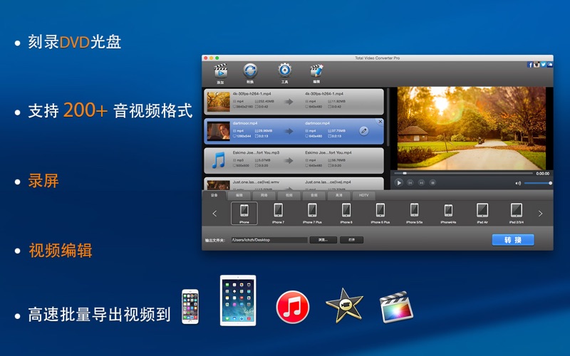 限时促销,原价¥200! Total Video Converter Pro = 视频/音频转换 + 视频刻录 + 屏幕录制 + 视频/音频编辑 + 视频/音频裁剪 + DVD刻录 + DV自动输入 + 视频合并/分割 + GIF输出 + 音频提取 + 视频特效 + 视频/音频复合 Total Video Converter Pro高级版本,是一个非常强大,全功能的转换器,视频编辑器和DVD刻录机,支持几乎所有的视频和音频格式。 主要特点: • 批量转换视频和音频文件到iPhone, iPad, iTunes, PS Vita, iMovie, Final Cut Pro。 • 高速刻录标清SD和高清HD视频到NTSC / PAL制式的DVD。 • 整合录屏软件,支持录制屏幕并输出无损视频。 • 提供直观交互的时间线编辑所有视频格式。 • 逐帧精确裁剪和剪辑视频和音频文件。 • 自由给视频添加喜欢的背景音乐。 • 自动导入DV视频(AVCHD/TOD/MOD),并很容易地转换到iMovie, FCP和其他移动设备。 • 合并多个视频片段为一个专业好看的电影。 • 从视频文件中无损提取视频和音频。 • 从视频文件导出GIF动画图像。 • 增加特效效果如翻转, 旋转, 灰色, 平滑, 使您的视频与众不同。 支持格式: • 完美支持的输出设备有:iPad, iPhone, iPod, PS Vita, HDV, DV, Xbox 360, PS3, PSP, Blackberry, Nokia, Samsung, Android, Zune, Creative Zen,等。 • 高度兼容HDV,DV视频格式:*.mod, *.tod, *.m2ts, *.evo, *.vro, *.mts等。 • 输入视频格式: WMV, MKV, AVI, DivX, XviD, MPEG, MP4, QT, RM, RMVB, M2TS, M2T, MTS, FLV, MPEG, MPEG2 TS, ASF, 3GP, 3G2, GIF, H.264/MPEG-4 AVC, H.264/PSP AVC Video等。 • 输入音频格式: MOV, FLV, WAV, MP3, MP2, AAC, M4A, WMA, FLAC, AMR, AWB, OGG, MMF, AC3, AU等。 • 输出视频格式: OGG, WebM, WMV, MKV, AVI, DivX, XviD, MPEG, MP4, MOV, QT, RM, RMVB, M2TS, M2T, MTS, FLV, MPEG, MPEG2 TS, ASF, 3GP, 3G2, GIF, SWF, H.264/MPEG-4 AVC, H.264/PSP AVC Video, H.264 TS, WMV-HD, MKV-HD, DivX-HD, Divx-HD, MOV-HD, FLV-HD, MP4-HD等。 • 输出的音频格式: WAV, MP3, MP2, AAC, M4A, WMA, FLAC, AMR, AWB, OGG, MMF, AC3, AU等。 技术支持: 如果你有任何问题,只需发送电子邮件到: support@effectmatrix.com 修复一些转换问题。