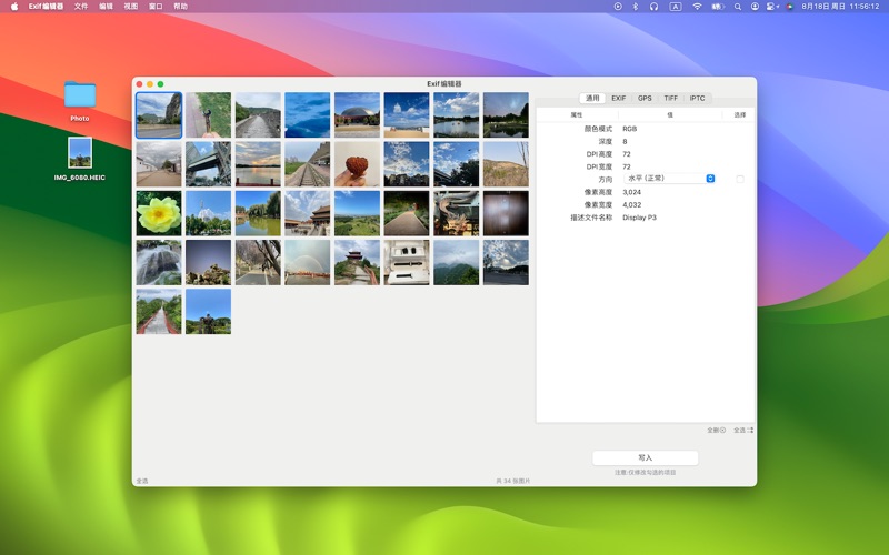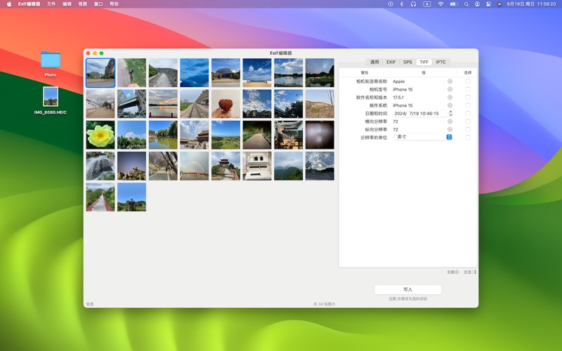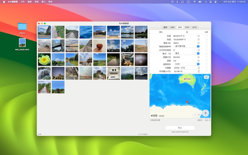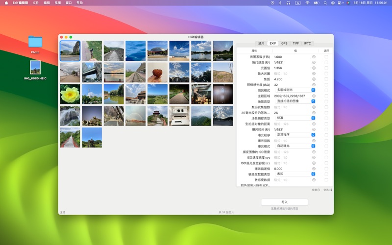 这是一个图片文件的Exif编辑器,你可以查看和编辑Exif、GPS、TIFF和IPTC分组中的属性信息。 1.你可以一次性导入多个图片文件。 2.可以同时选择图片文件或文件夹,App负责挑选和显示出支持的文件。 3.点击某个图片文件,即可显示出来相关属性信息。 4.你可以修改(清空)某个属性的值,然后勾选希望修改这个属性。必须勾选后才能写入,这是因为App将不对未勾选的属性做任何操作,帮你保留它原来的样子。因为有些属性是只读的,所以它未提供勾选框。 5.为图片添加GPS信息时,你需要通过长按地图来选择位置,而不是手动输入经纬度,但你可以清空它。 6.你可以同时选择多个图片(窗口左下角有全选按钮,或通过鼠标框选),一次将属性值写入到多个图片中。 根据ExifTool的统计(截止2024年7月21日),他们共识别出来27895 个标签,其中有 17462 个唯一标签名称。 在Apple提供的API中约有200个左右的标签,我们从其中挑选了约100个常用的标签。 大家如果有更多的需要,以及任何建议或意见,欢迎来邮件。 macostool@qq.com 优化图片加载速度。