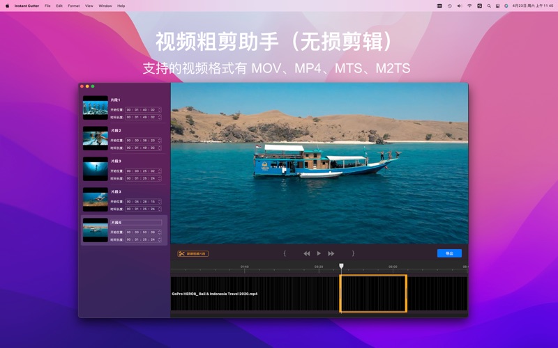 使用这款软件您可以快速轻松地剪切和修剪视频。无论您是视频编辑专业人士,还是完全的初学者,您都会发现我们的软件使用起来非常简单。只需选择一个视频文件并使用时间线拖动视频的结尾。 这款软件允许您以格式导入大型视频文件并快速修剪它们而无需重新编码。如果您正在处理高分辨率视频(例如 4K 运动相机镜头),这是一个特别有用的工具,因为这些文件大小往往更大,这非常适合通过粗剪从摄像机拍摄的大型视频文件来节省空间、GoPro、无人机等。 使用向导: 1. 选择视频加入软件 点击 “选择视频文件” 按钮从电脑中选择一个视频文件,也可直接拖拽要剪辑的视频文件至软件。 2. 设定剪辑时间点 移动时间滑块确定剪辑开始和结束位置,也可在左边列表中直接输入开始和结束时间。 如果想要一次性剪出多个片段,点击 “新建视频片段”,然后对新建的视频片段设置时间。 3. 保存视频 点击 “导出” 按钮确定保存位置后保存,几秒钟后您剪辑的片段就会生成在您指定的文件夹。 Bug fixes and improvements.