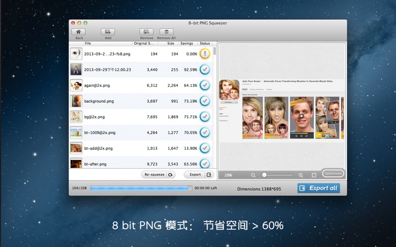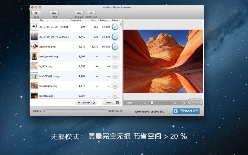 限时1折促销。原价100元。只为手快的您准备。 不要错过“超级抠图”,一键抠图工具,从此告别PS的蜗牛抠图。现正半价促销。需要的快下手! 无损图片瘦身Lossless Photo Squeezer是一款大量压缩图像容量而丝毫无损图片质量的专业工具。专业优化PNG,JPEG和GIF等格式的图片大小。您可以优化您所有的照片,从而挤出大量的硬盘空间,网络空间,同时,您可以更多更快地在线储存和共享照片。 更特别的是,无损图片瘦身Lossless Photo Squeezer支持导入整个目录(包括子目录),而图片输出时可以回到原有目录结构。正是这种独特的功能,你不需要花费额外的时间来重新组织那些被您优化后照片。 它是如何工作的? 有三种模式供您选择:质量完全无损模式(PNG,JPG,GIF);质量轻微受损模式(JPG);PNG 8位模式。 - 质量完全无损模式(PNG,JPG,GIF),将节省空间 > 20 % ,但保持原有的分辨率,质量完全无损。 - 质量轻微受损模式(JPG),将节省空间 > 50 %,质量轻微损失。 - PNG 8位模式,将PNG 24色转换为PNG 256色,节省空间 > 60% 优点: - 节约宝贵的网络空间,网上帐户空间,硬盘空间等等。 - 大大节约网络传输时间。上传50张高清图像到您的在线图库通常需要1小时,而使用无损图片瘦身Lossless Photo Squeezer后,您就只需要花费10分钟而已。 - 节省人力。这个有用的工具可以让您迅速在网上发图,而不是打开Photoshop或其他应用工具先编辑后才能发。 - 无视邮箱容量的限制.在大多数情况下,你只能用邮箱发送10 MB大小的附件。而无损图片瘦身Lossless Photo Squeezer可以帮您的图片轻松瘦身。 特点: - 简单易用。 - 三种模式供您选择:质量完全无损模式(PNG,JPG,GIF);质量轻微受损模式(JPG);PNG 8位模式。 - 支持导入整个目录(包括子目录),而图片输出时可以回到原有目录结构。 - 直接拖动照片,文件夹到程序中优化。 - 缩小图片的同时,图片质量无损。 - 支持单图或批处理。 反馈: 任何建议将不胜感激,支持邮箱:market@effectmatrix.com * “Super Vectorizer”,一键位图转AI,SVG和PDF矢量图,限时5折优惠! * 限时赠送:今天购买“超级抠图 Super PhotoCut”的用户,将会免费得到一份价值120元的"无损图片压缩Photo Size Optimizer"的正版软件,可以修改图片尺寸并无损压缩图片大小,终身使用。请发邮件及购买记录到market@effectmatrix.com 获取免费注册码,需要看到购买日期,谢谢。 * 更好的支持新系统 macOS Sierra。 * 修正了一些软件错误。