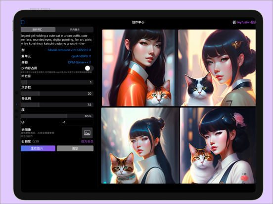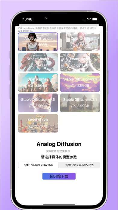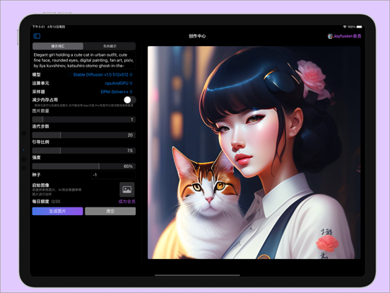JoyFusion是一款一款原生基于Stable Diffusion和 CorelML的 AI 绘画macOS,iPadOS,iOS应用,并且iOS端支持云端推理功能。 通过Joyfusion,只需输入一些提示词或概念,剩下的就由我们的人工智能来完成。这一切都是在你的设备本地运算生成的。无论你是设计师、创作者,Joyfusion都能为大家提供服务。你可以使用Joyfusion为你的文章配图,把心中的概念和想法通过图片呈现。当然你也可以制作精美的头像或者表情。为什么还要等待呢?今天就试试Joyfusion,看看创造令人惊叹的视觉效果是多么容易,它将使你的工作提升到一个新的水平。 功能列表: 本地AI模型支持, AI原生模型支持开箱即用,无需联网,隐私保护; 多种本地模型, 多种风格的本地模型种类可选; 60多种风格模板,一键套用,快速得到主题化效果。 激发你的创作灵感,智能提示和工作流模版,帮你快速拓展创意与完成作品; 先进的模型能力, 对齐最新的模型能力和效果,抢先体验; FAQ JoyFusion使用本地推理模式时需要在本地完成AI绘画过程期间需要消耗大量的内存空间,我们建议使用较新的设备使用。如果您如果闪退的问题可以通过邮箱联系开发者。 本地推理模式推荐机型 iPhone 12 Pro及以上 Apple芯片iPad设备 内购项目说明 在确认购买时,付款将从您的Apple ID账户中扣除。除非在当前期限结束前至少24小时取消,否则订阅将自动续期。你的账户将在当前期限结束前24小时内被收取续期费用。您可以在购买后进入App Store的账户设置来管理和取消您的订阅。 邮箱 jiangdi0924@gmail.com Terms: https://joyfusion.notion.site/Terms-a98fd0430f814a788a4413dc7c195f60 Privacy: https://joyfusion.notion.site/Privacy-Policy-4e01ea6bb3c944089a71da4dfd31bb1f - 解决模型下载源不可用的问题 - UI优化