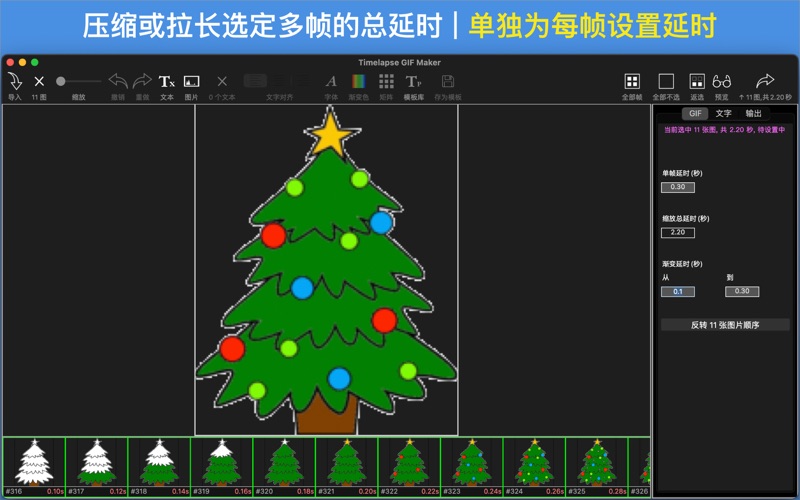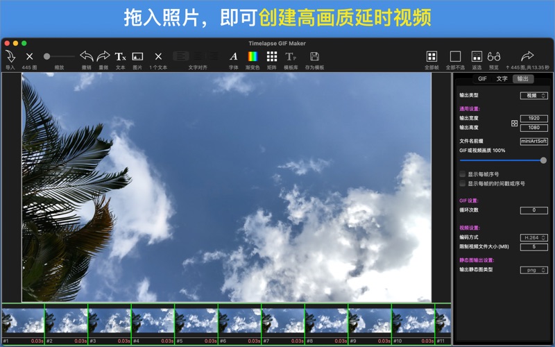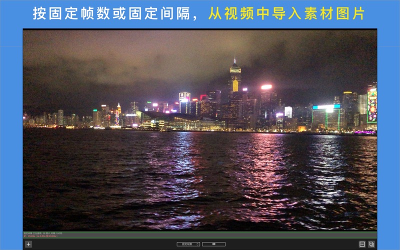 - 用视频、照片或GIF为元素,创建新的GIF动图 或 延时视频 - 重编辑已有的GIF文件(保持原有的每帧延时),调整帧序或帧延时,按帧打水印。 - 拼接已有的多个GIF - 批量从视频或GIF中提取静态图 请注意: 轻量版制作GIF或视频时,输出像素被限制为500X500。 特点: - 为每一帧设置丰富的图文水印设置 - 支持图片|视频|GIF素材的导入 - 支持单独为每帧设置时延 - 渐变式帧时延 - 反转图片顺序 - 图片输出质量调整 从视频中提取素材帧: - 手动提取指定时间点的图片 - 按固定帧数提取 - 按固定的间隔时间提取 如何工作: 1. 将图片或视频拖到工具栏最左侧的[导入]图标上 2. 添加水印文字或图片 3. 选取要输出的帧 4.将工具栏最右侧的[导出]图标拖到窗口之外,拖到您想要的目标,即可保存 常见问题 Q:怎么为每一帧添加水印? A:1. 点击工具栏上的[全部],选择全部帧,或在窗口底部的帧列表中,先按下Command键,再鼠标左键,选取一帧或多帧 2.在设计视图中添加文本或图片 3.在工具栏中点击[复制到],即可将设计视图中的图文元素应用到所选择的帧上去 Q : 如何获取帮助? A : 1. 将鼠标放在控件上,即可显示帮助信息 2.点击帮助菜单,通过网站或邮件获取支持 ----------------------------- 键盘命令: Command + Z 撤销 Command + Shift + Z 重做 (Control 或 Command) + 左键 进行多目标选择 Command + A 选择所有 Command + Shift + A 不选所有 Command + C 拷贝目标 Command + V 粘贴一个或多个目标 ( 粘贴前,您须用鼠标左键在设计视图您想添加的空白位置点击一次) Backspace 删除目标 ----------------------------- 帧列表操作: 点击缩略图,进行帧选择 Command 或 Control + 左键,同进选择多帧 在缩略图上点击右键,弹出更多选项 Command or Control + a 选择全部帧 Command or Control + A 不选全部帧 Delete键 删除所选择的帧 支持输入的文件类型: 视频: MOV | M4V | MP4 | 3GP | AVI | MPEG | MPEG2 | MPG 图片: JPG | JPEG | PNG | TIF | TIFF | DNG | RAW | 3FR | PPM | DCR | ORF | ARW | RAF | NEF | CR2 | RW2 | IIQ | MEF | MRW | PEF | MOS | ERF | BMP | GIF | ICNS | ICO | JP2 | J2K | JPF | JPX | JPM | MJ2| 1. 支持PreRes4444编码,使输出的视频保持透明背景,便于在别的视频编辑软件中使用该视频素材