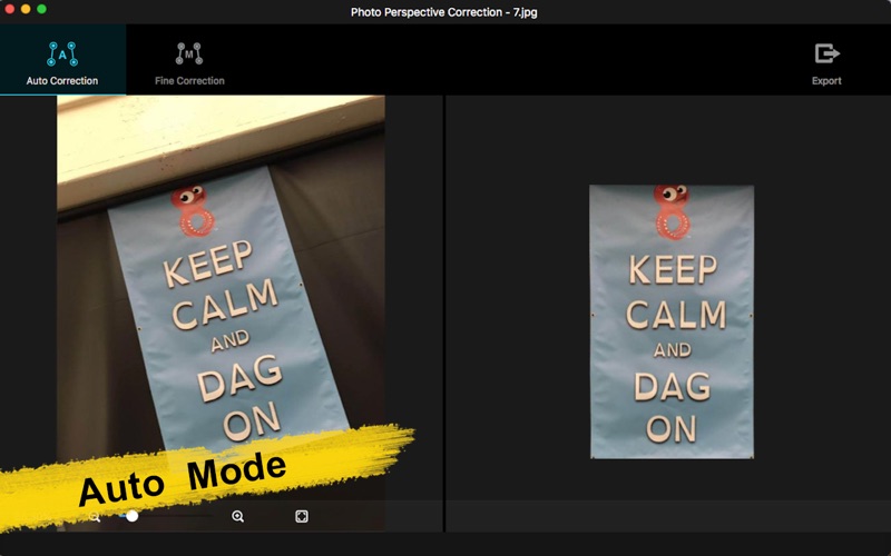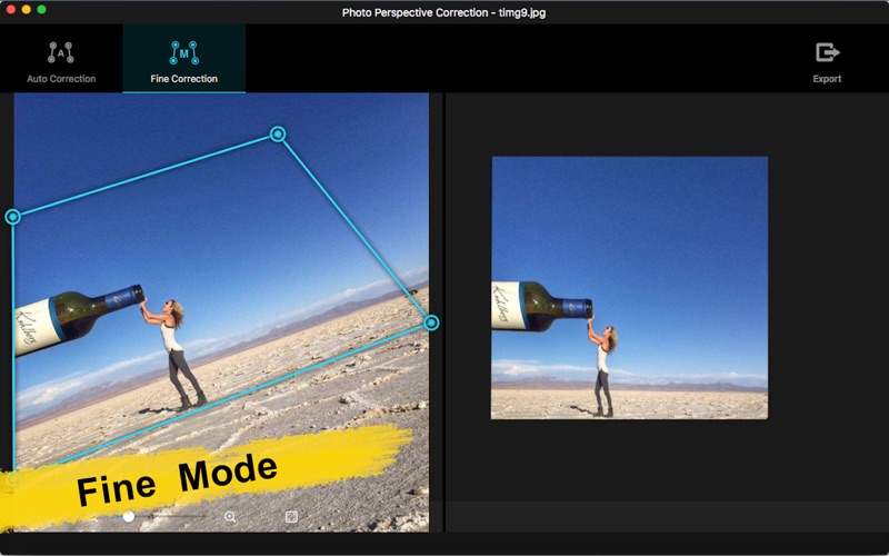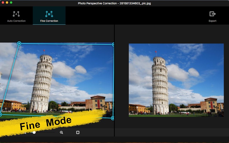 Photo Perspective Correction是一款专业自动快速修复倾斜、透视和变形图片;拉直和调整变形照片;将非矩形扭曲图片修正为矩形图像;也可以反扭曲照片或图形;简单操作的同时也能获得非常专业的效果! -校正照片中扭曲、变形、不平衡、倾斜等问题; -矫正图片中倾斜的对象;矫正图片中呈一定角度的对象; -倾斜地平线拉直; -拉直照片。 支持:所用常用图像格式导入,图片缩放,窗口铺满,鼠标移动图片,修正图片保存等功能。 Photo Perspective Correction有两种操作模式供您选择: 1.自动修正 系统自动识别变形图片,自动识别校正图片的边缘,自动校正图片,只要输入原图,即可获得专业的修复效果。 -直接将图片拖进软件或者拖到图标上; -自动识别并纠正复杂的透视问题; -自动识别优化至最大可视区域; -保存修正图片。 2.精细修正 在精细调整模式中,可以根据您的喜好,进行调整和修复图片。 -双组可调四边形最优控制; -实时显示修正后效果图; -保存修正图片。 如果您在使用过程中有任何问题,可以发送邮件到ColorLemoStudio@yeah.net。 1.修复小bug