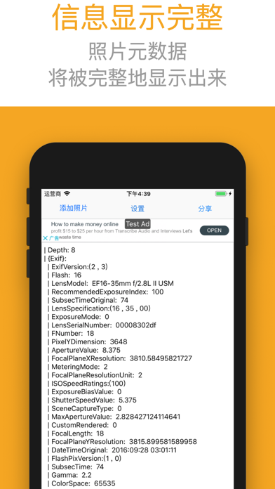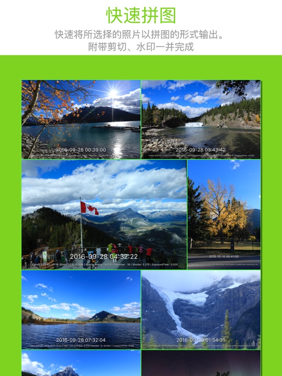 批量打水印 | 查看照片拍摄参数 | GIF制作 | 长拼图 | 批量裁图改尺寸。 特性: - 制作塔状长拼图 - 批量裁图改尺寸 - 可以在照片上打印拍摄时间 | 地点 | 相机及镜头型号 等信息 - 显示照片的拍照时间 | 文件名 | 文件大小 - 按EXIF关键词排序,如按经纬度 | 相机类型 | 镜头参数 | 光圈 等排序 - 按拍照时间 | 照片长宽比 | 文件名 | 文件大小 排序 - 按文本方式批量导出所选择照片的EXIF值。 - 删除照片元数据,如相机镜头参数、拍照地点等 如何在照片上打印时间地点等信息? 1. 导入照片 2.选择要显示的照片信息元素,如拍照时间 | 拍照地点 | 相机参数 3. 预览,并根据实际效果调整位置 | 宽度 | 背景 | 文字色彩 4. 保存(覆盖和复制两种模式) 其它特点: 可将当前设置作为模板保存,以备将来重复使用. 文件保存模式: --拷贝模式: 先复制照片,再在新照片上添加文本信息。 文件安全性更高。 --覆盖模式: 直接将文本信息添加在原照片上。 更改后,如您需要复原,请在系统相册里选择相应的照片 -> 编辑 ->复原 在每张图上添加【信息】按纽,方便用户获取EXIF信息