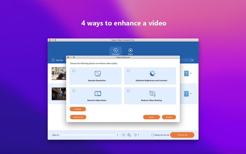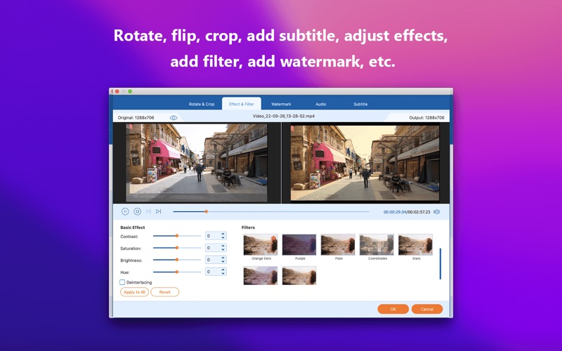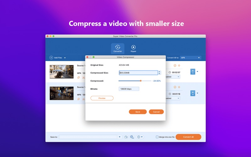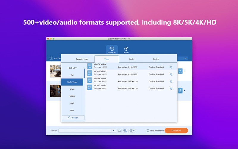 视频转换,编辑和播放合二为一。 超级视频转换器专业版可以将任何视频,如MTS,M2TS,TS,TRP,MP4,3GP,MOV,M4V,MKV,AVI,WMV,FLV,MKV转换为100 + 2D / 3D视频/音频格式。 此外,它还提供各种视频编辑功能,使视频具有更好的视觉效果。最近升级后,它具有更多编辑选项。 1. 将视频转换为 MP4、MKV、AVI、MOV、WMV 等 * 将几乎所有视频/音频转换为所需格式 您可以将 M2TS、MTS、MKV、FLV、AVI、WMV、MP4、MOV、M4V、MP3、MP2、FLAC、AAC、ALAC、AC3、M4A、WMA、WAV 等任何视频/音频格式转换为任何流行的视频/音频格式甚至 GIF。并且支持所有编码格式,包括H.265/HEVC、H.264、Xvid、VP8、VP9等。 *将任何视频升级到 HD/4K/5K/8K 分辨率 现在它支持将视频从低分辨率转换为 4K/5K/8K。例如,您可以将标清/高清视频转换为 4K。转换后,您可以在 4K 播放器上欣赏 4K 视频。 * 高度支持输出3D视频格式 Super Video Converter Pro 可以将几乎所有通用 2D 视频格式转换为 3D 视频,例如并排 3D、上下 3D 和立体 3D 视频。因此,您可以在任何 3D 播放器设备上欣赏 3D 视频。 *将视频转换为任何便携式设备 除了流行的视频/音频格式外,它还具有专为iPhone,Apple TV,热门视频编辑软件和热门视频网站设计的预设配置文件。例如,如果您想将视频上传到 Tiktok,只需选择特定的配置文件,您就可以获得具有正确分辨率、编码器、纵横比和其他所需设置的视频。 2.美化视频效果 * 为您的视频添加过滤器(新) 现在它提供了十几种不同的过滤器供您选择。不同的滤镜会产生不同的视频效果。 * 编辑媒体元数据(新) 您可以更改媒体文件的封面、标题、艺术家和其他元数据信息。 * 将视频压缩到更小的尺寸(新) 您可以调整压缩率并预览输出文件的大小。 * 提高视频质量(新) 现在它有四个新的强大功能来提高您的视频质量:高档分辨率、优化亮度和对比度、去除视频噪音和稳定抖动的视频。 *多种视频编辑功能可供选择 您可以调整视频效果(亮度、饱和度、对比度、色调和音量);修剪视频长度;裁剪视频帧以去除黑边;添加文本/图像水印;并将多个文件合并为一个新的文件。 *添加音轨和字幕 您可以选择启用/禁用音轨和字幕。您还可以选择要使用的音轨和字幕。您甚至可以为视频添加外部音轨和字幕。 3.支持批量转换,界面友好 * 批量转换 此视频文件转换器可以同时将一个或多个源文件转换为不同的格式。 *预览和快照 这个应用程序拥有一个内置的播放器,可以帮助您预览视频效果。在预览过程中,您可以捕获喜欢的图片并将其保存为图像。 支持的输出格式和视频编辑软件: * 支持的输出格式: 通用视频:MPG、MPEG-1、MPEG-2、MPEG-4、H.264、H.264/MPEG-4 AVC、DivX、XviD、AVI、FLV、MP4、M4V、MKV、MOV、3GP、3G2、 MTV、SWF、WMV、WMV-2、ASF、DPG、TS、DV、VOB、AMV、WebM 高清视频:TS、高清 MP4、高清 AVI、高清 MOV、高清 ASF、高清 H.264/MPEG-4 AVC、高清 MPEG-4、MPEG-2 高清、高清 MKV、高清 MPG、高清 MPEG-4 TS、MPEG -2 TS 高清、高清 H.264 TS、DivX 高清、XviD 高清、YouTube 高清、高清 FLV、高清 WMV、高清 VOB、高清 WebM 4K 视频:4K H.265/HEVC、4K H.264/MPEG-4 AVC、4K MPEG-4、WebM-VP8 4K WebM、WebM-VP9 4K WebM、4K H.264 TS、4K AVI、XviD 4K、4K H.264 TS、4K AVI、XviD 4K、4K H.264 FLV、4K MKV、YouTube 4K 5K/8K 视频:MP4 5K 视频、MKV 5K 视频、MP4 8K 视频、MKV 8K 视频 *** 它适用于 OS X 10.7 或更高版本! *** 需要帮忙?请通过 https://www.anymp4.com/app-store/contact.html 联系我们,您将在 24 小时内收到回复。 如果您喜欢这个应用程序,请不要犹豫,留下评论。 1. 解决部分文件预览和输出只有音频 没有画面的问题 2. 提高了视频转换的稳定性和速度