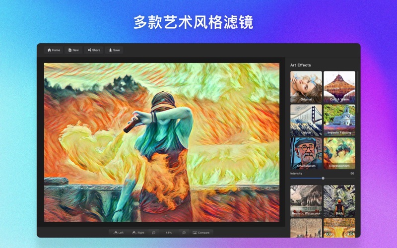 使用大画家,一键将您的照片变为NFT艺术作品! 大画家是一款专注于艺术风格滤镜的照片编辑工具,基于强大的人工智能技术,可以快速地将您手中的照片,变为如同梵高、莫奈、毕加索等大师亲手绘制的艺术作品,为日常的摄影作品带来全新的生命力。 通过简单的操作,就可以创造您的NFT艺术作品,再通过其他平台创造为NFT,并在OpenSea、Axie Infinity或SuperRare等各个市场上进行出售。 【丰富的艺术滤镜】 印象派、梵高、浮世绘、素描等多款不同风格、流派的艺术滤镜,帮您实现与众不同的创意追求,让普通摄影作品也可以成为真正的艺术。 【简单操作,自由调节】 不需要任何复杂操作,一键即可快速、简便的生成艺术作品,支持滤镜强度自由调节,以达到最满意的效果。 【高清大图,支持打印】 支持导出八百万像素的高清图片,让您的艺术作品不仅仅是画作,更可以出现在T恤、框画、照片作品集等各种实体物件之中。 GoArt订阅费用,根据不同的方案按月或按年收取。购买GoArt的账号,会在确认购买后支付相关费用。订阅到期后将自动续订,除非您在当前订阅周期结束前至少24小时关闭自动续订。一旦确认订阅,将根据您选择的套餐从您的iTunes账户扣费。购买后,可前往iTunes设置来管理订阅,以及关掉自动更新操作。本月取消,次月生效。 服务条款:https://goart.fotor.com/desktop/mac/GoArt-Privacy-Policy.pdf 隐私政策:https://goart.fotor.com/desktop/mac/GoArt-Terms-of-Services.pdf *新增特效资源