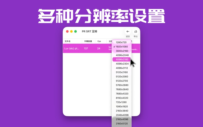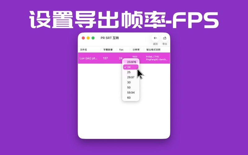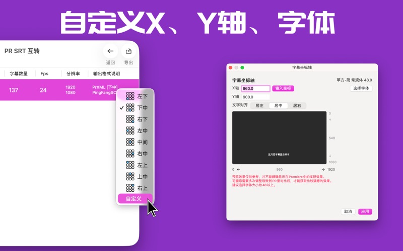 还在为转换Premiere Pro 标题文字头大吗?批量搞定 Premiere Pro 标题文字转 SRT 字幕。 本软件主要功能: * 支持 Premiere Pro XML 与 srt 文件互转 * 支持 Pr XML 导出时设置帧率、字幕位置。 * 支持批量拖放PrXML 与 srt 文件 * 采用Swift开发,体积小巧,启动迅速 * 兼容性好:最低系统能支持到 macOS 10.11 * 支持 Apple Silicon / Intel 芯片的Mac 使用说明: 1. 打开软件。 2. 把要转换的srt文件/ Prxml文件拖放到App里。 3. 点选“导出”。 测试环境: 支持 Premiere Pro 2021 / 2022 如果碰到兼容性问题,或者其它奇怪的问题,请与我邮件联系,我会尽快回复您。 联系方式: Email: hahale89@outlook.com 1. 最低支持macOS10.13。